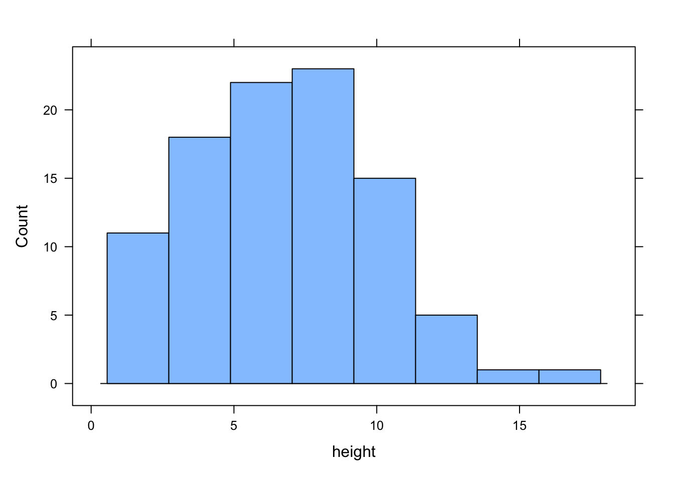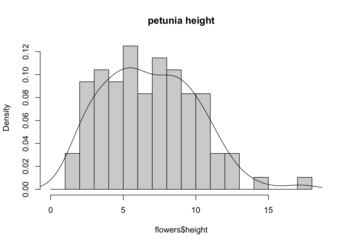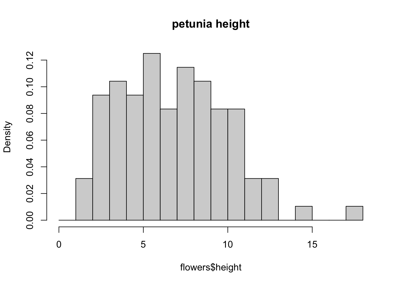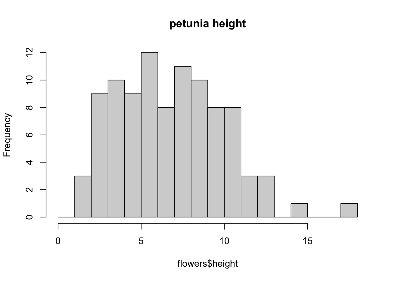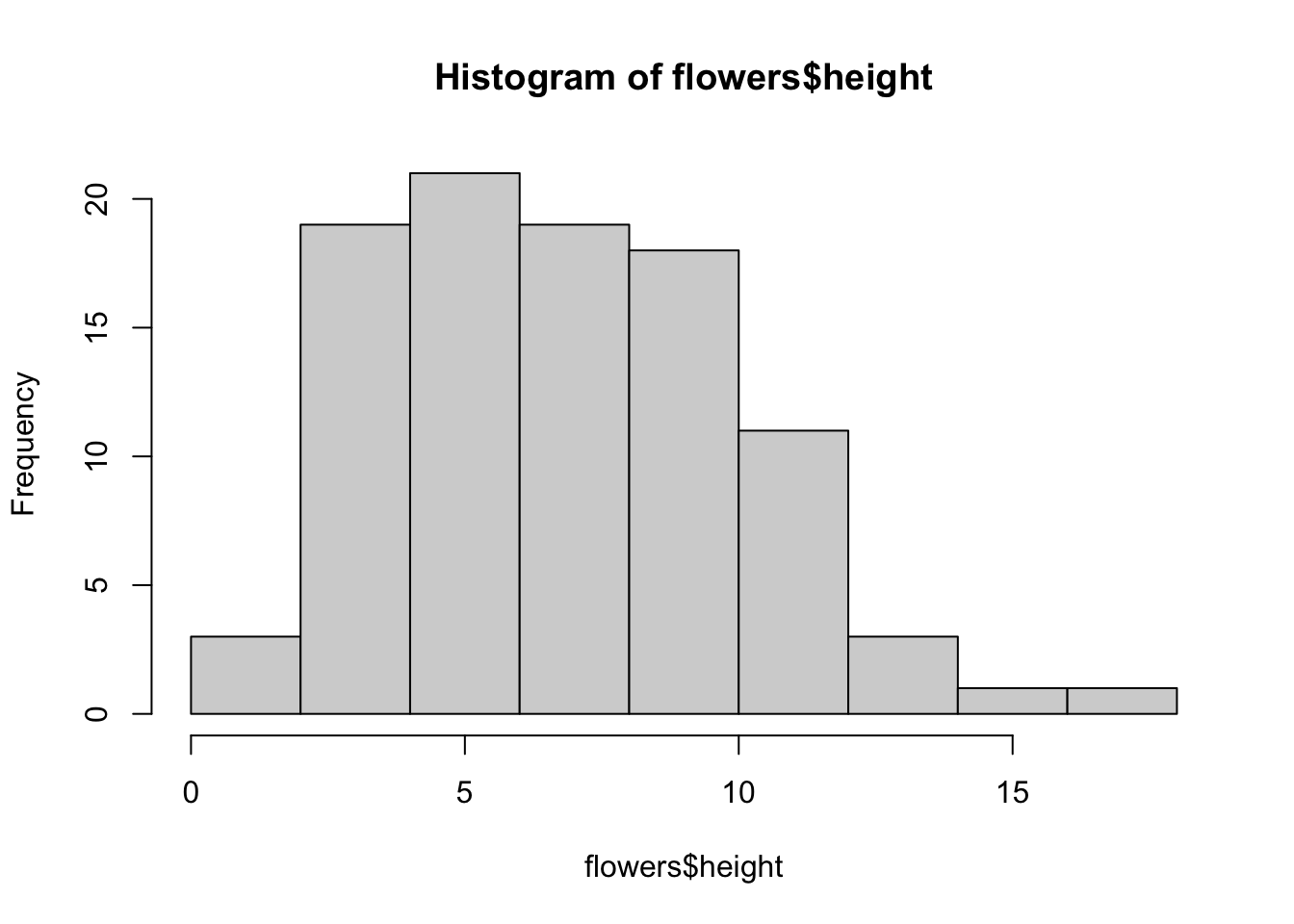 The hist() function automatically creates the breakpoints (or bins) in the histogram using the [Sturges][sturges] formula unless you specify otherwise by using the break = argument. For example, let’s say we want to plot our histogram with breakpoints every 1 cm flower height. We first generate a sequence from zero to the maximum value of height (18 rounded up) in steps of 1 using the seq() function. We can then use this sequence with the breaks = argument. While we’re at it, let’s also replace the ugly title for something a little better using the main = argument