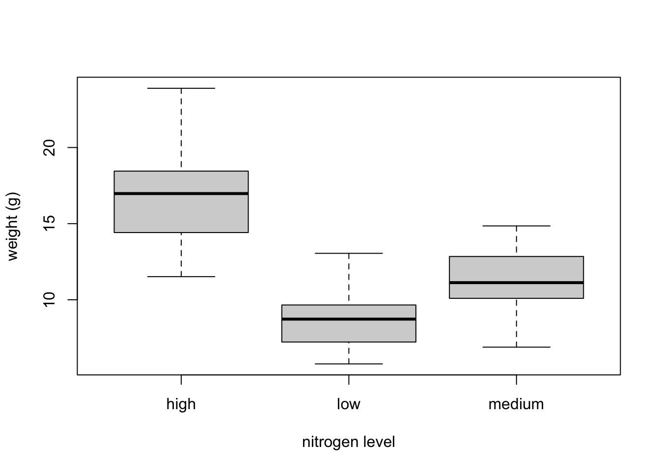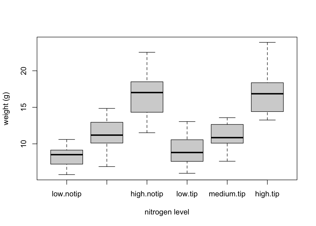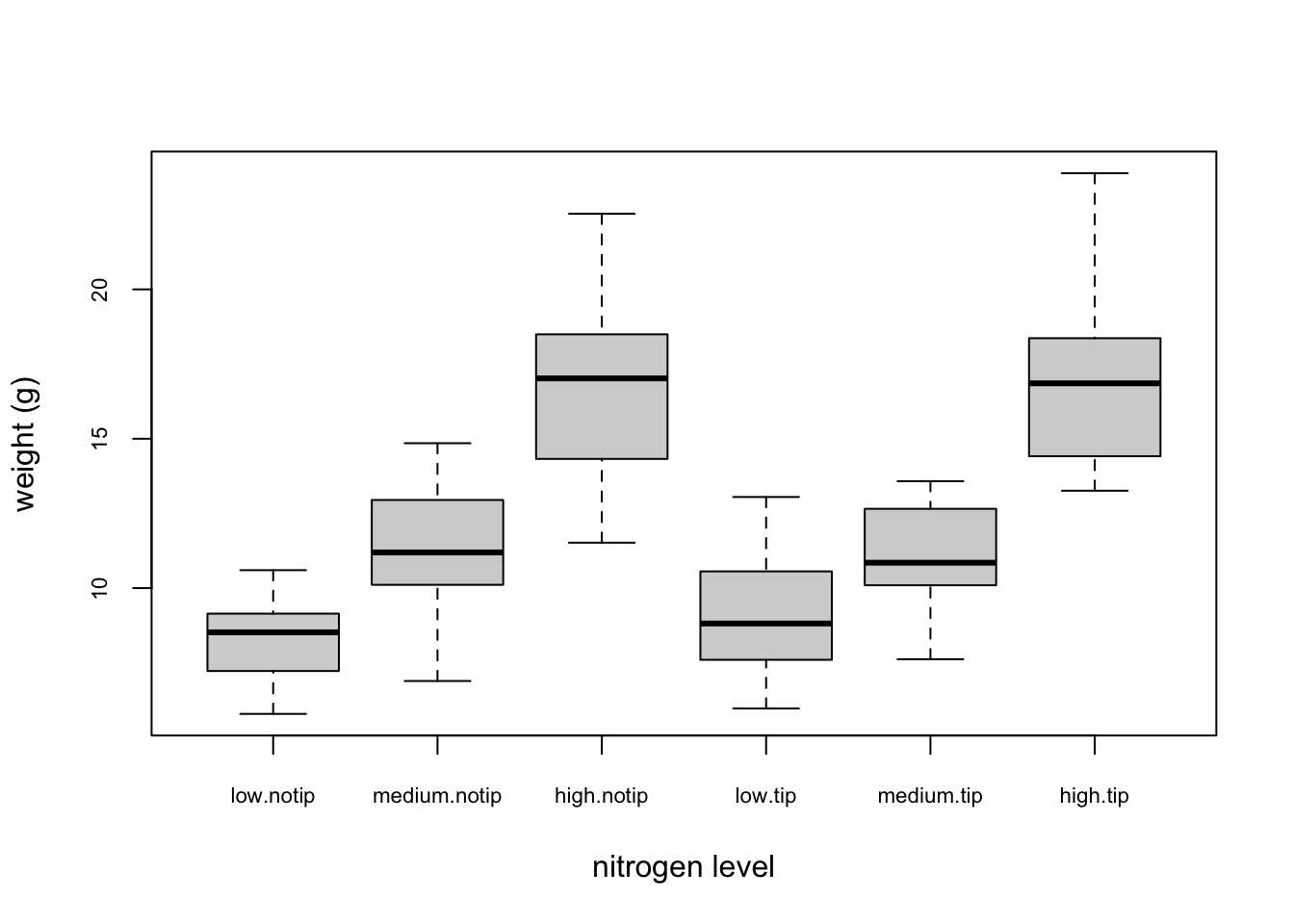 ylab = "weight (g)", xlab = "nitrogen level")