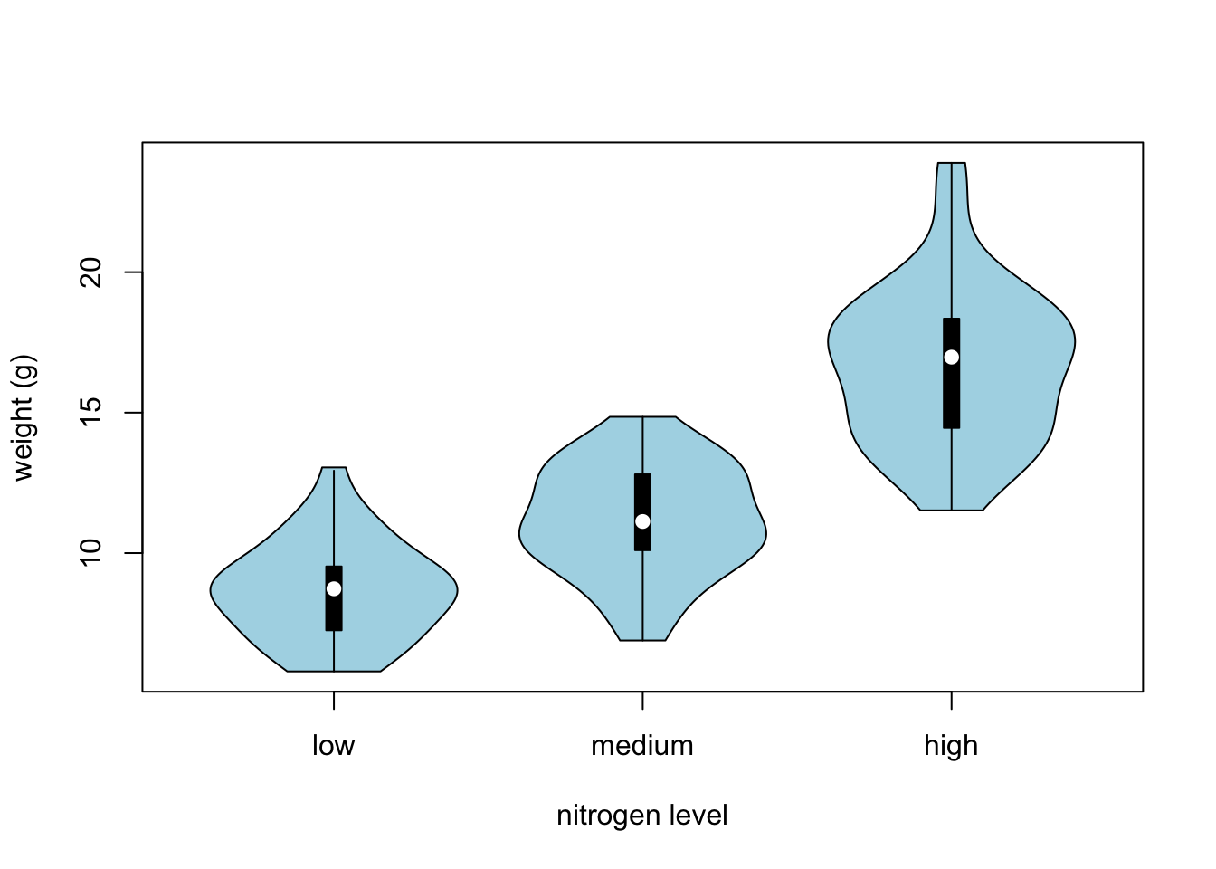 vioplot(weight ~ nitrogen, data = flowers,