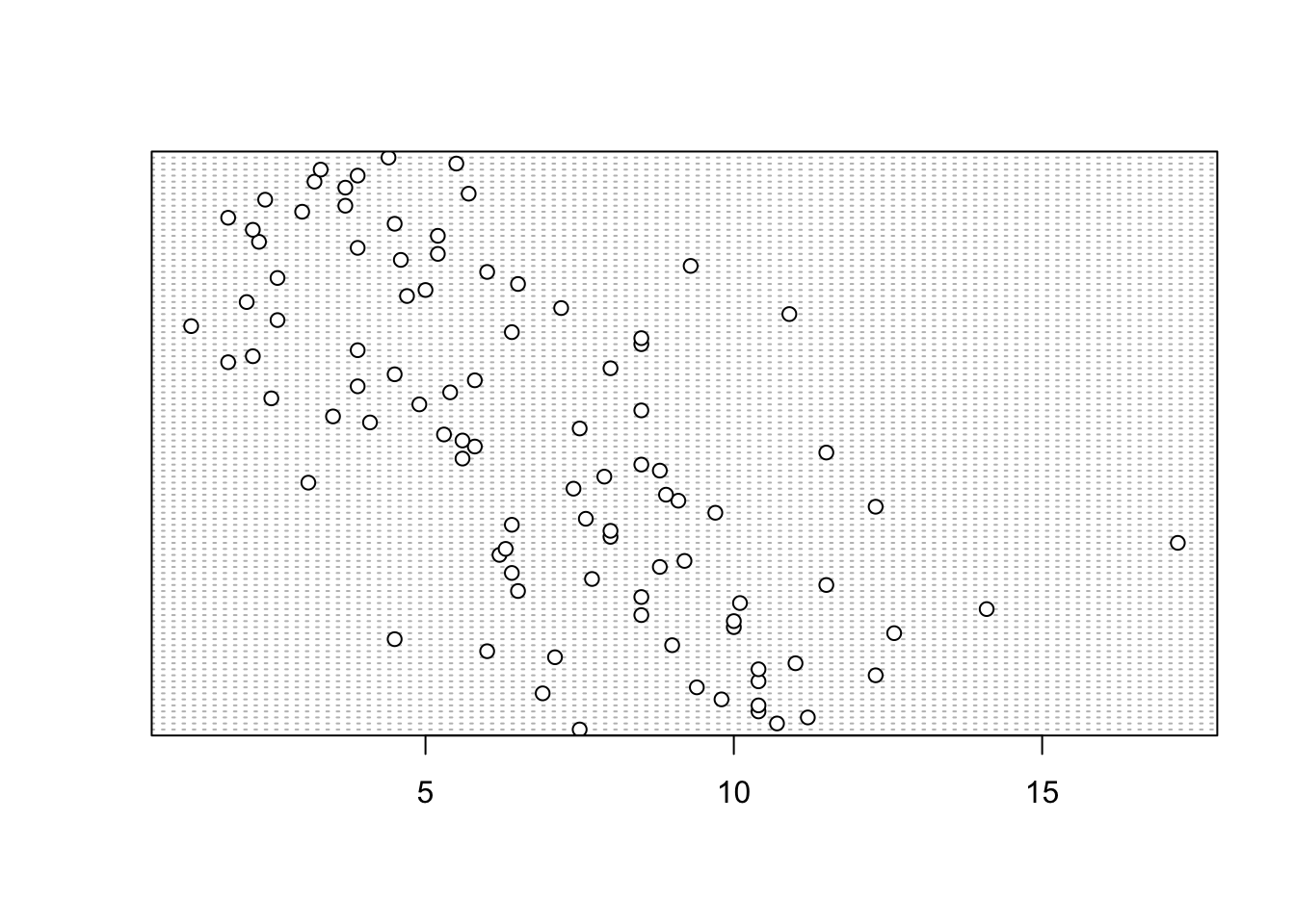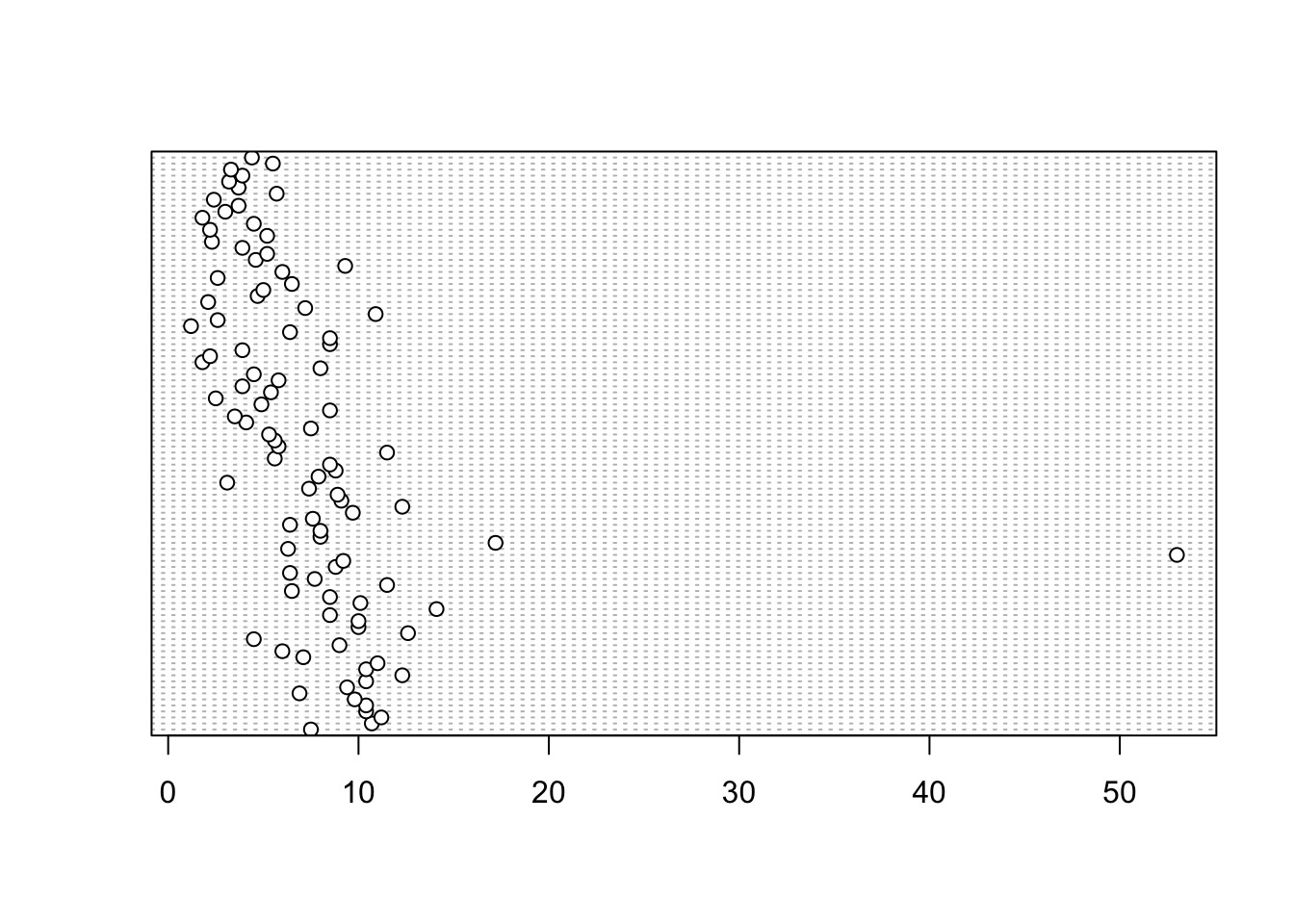 In the dotplot above the data from the height variable is plotted along the x axis and the data is plotted in the order it occurs in the flowers data frame on the y axis (values near the top of the y axis occur later in the data frame with those lower down occurring at the beginning of the data frame). In this plot we have a single value extending to the right at about 17 cm but it doesn’t appear particularly large compared to the rest. An example of a dotplot with an unusual observation is given below.