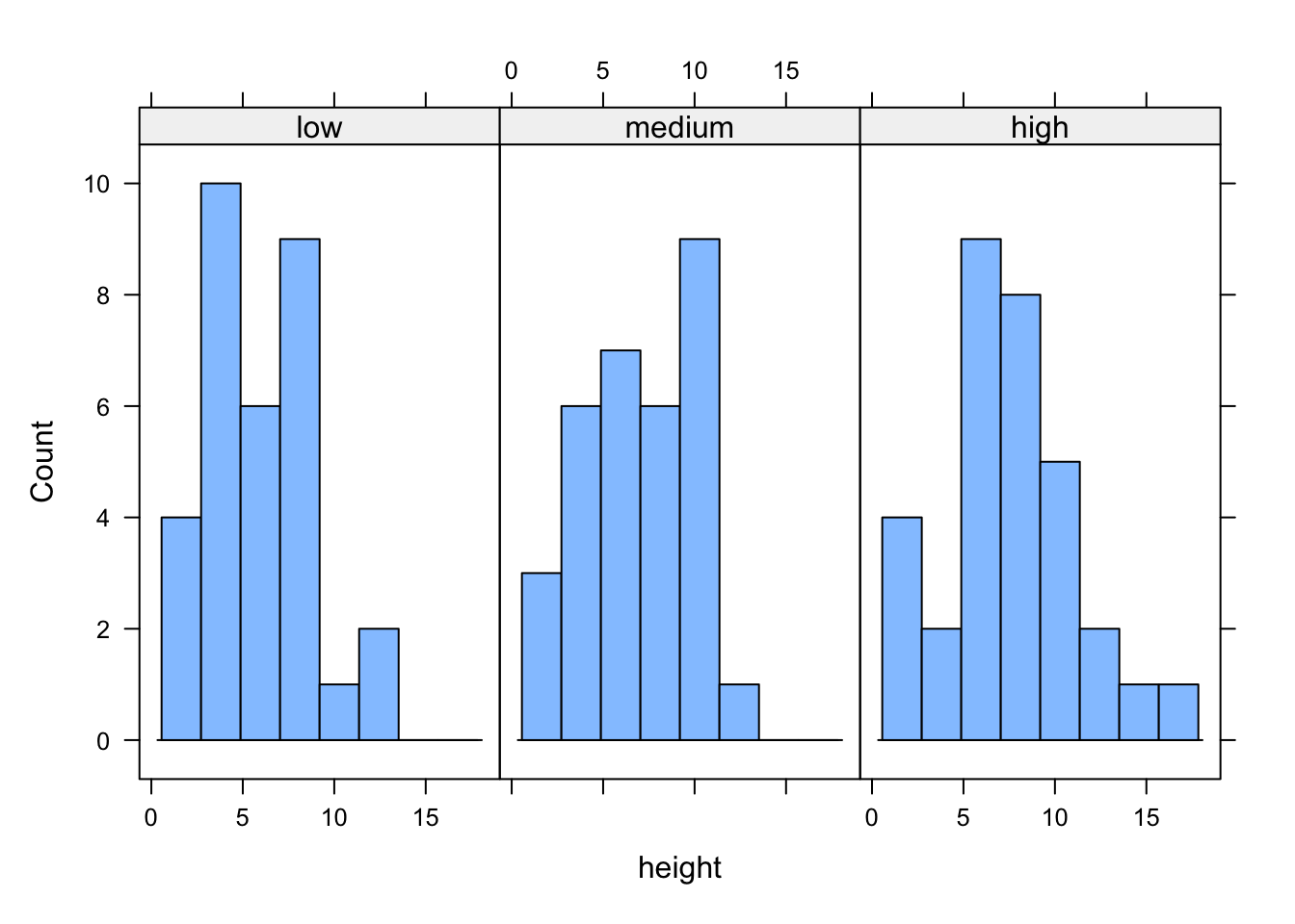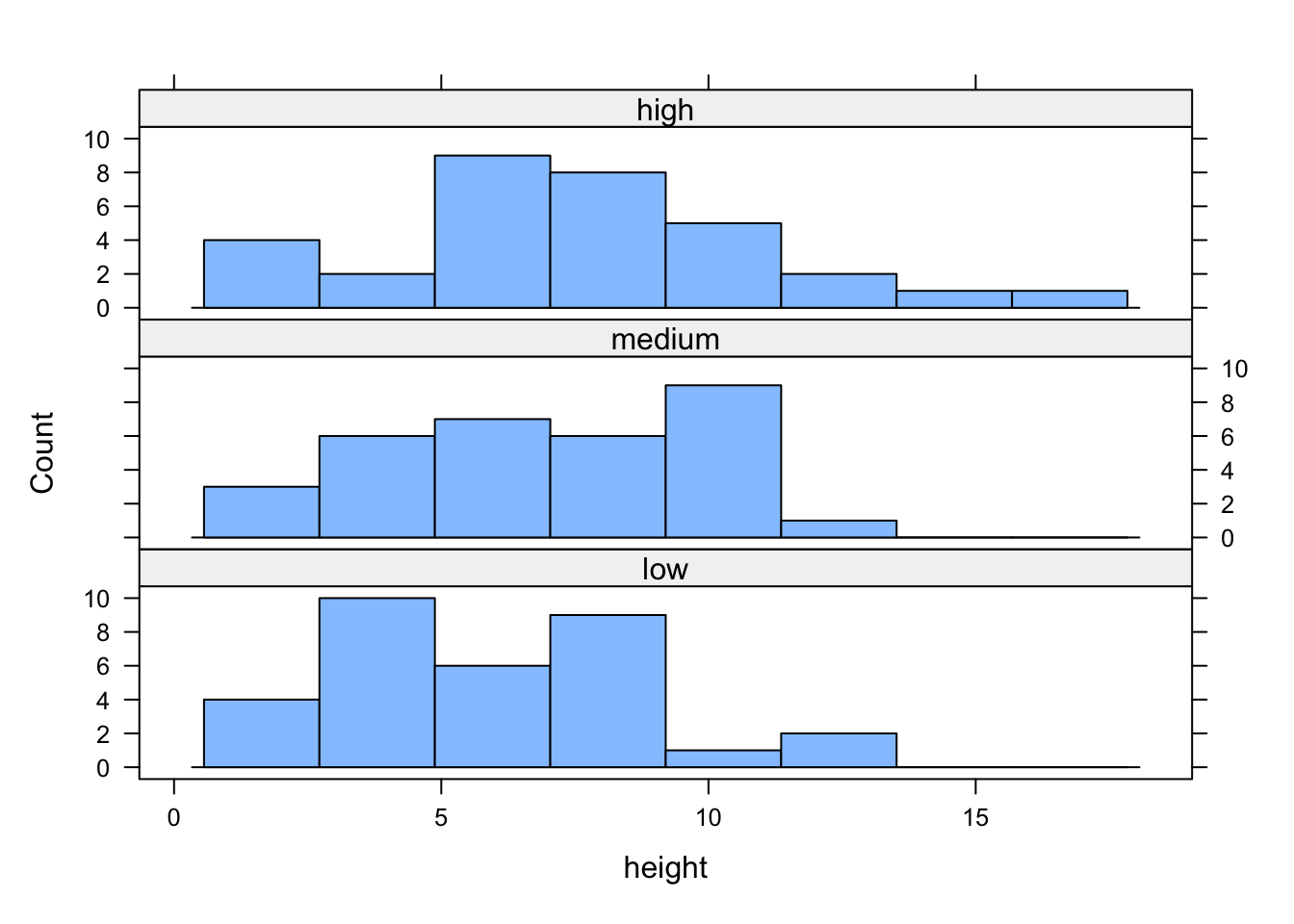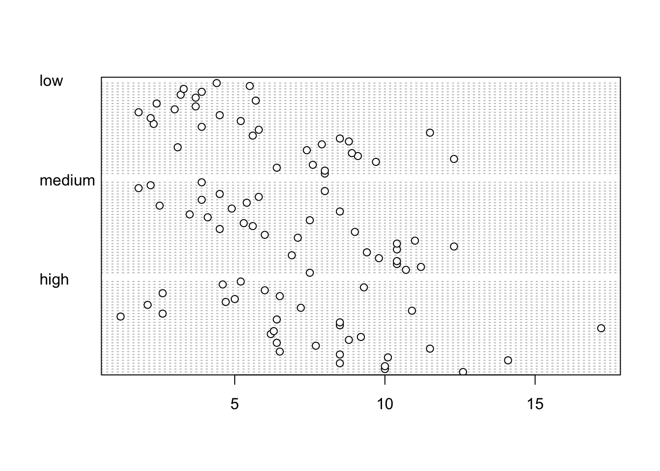 dotchart(flowers$height, groups = flowers$nitrogen)