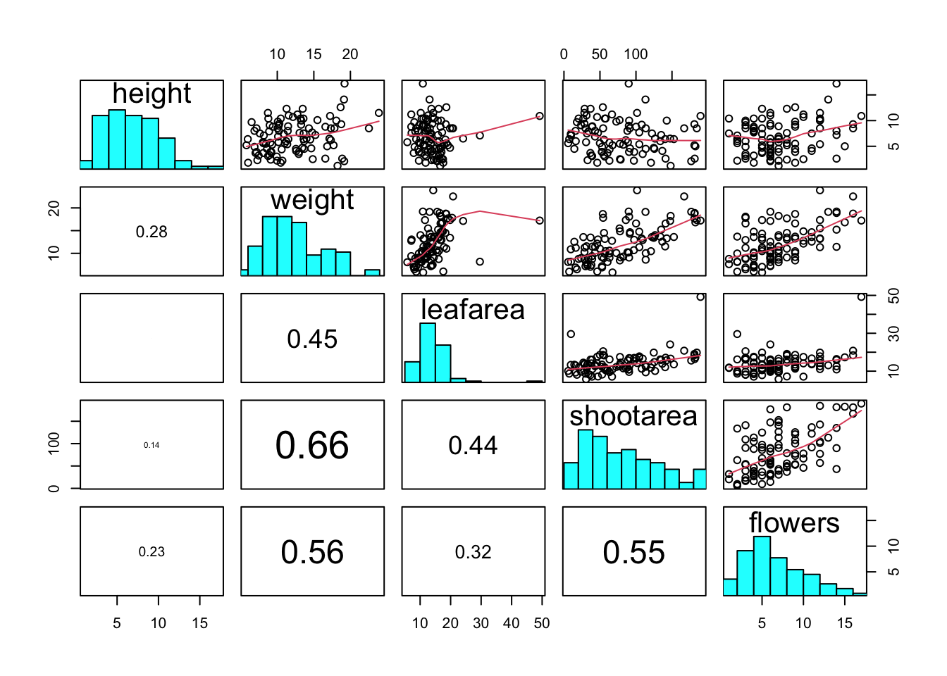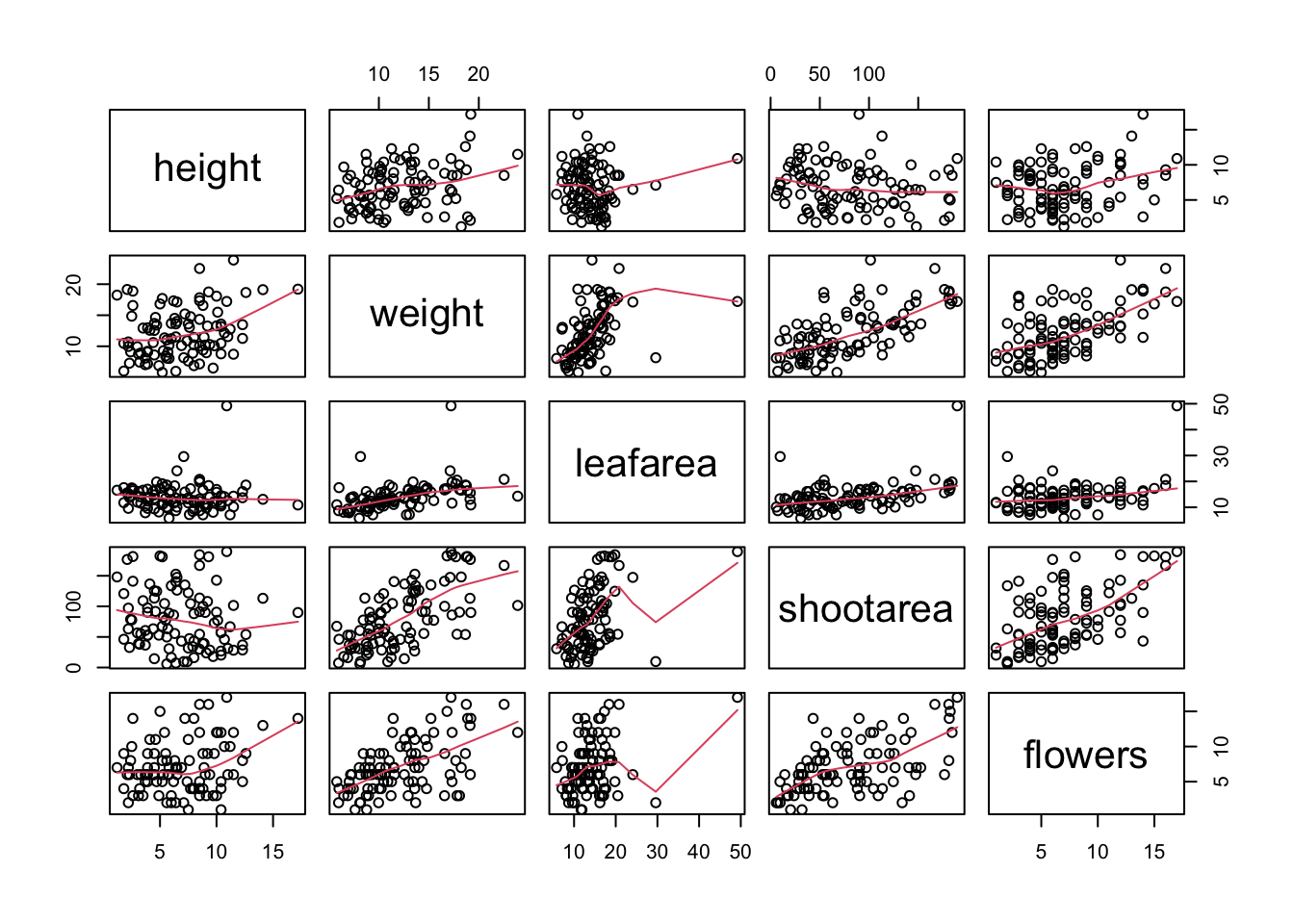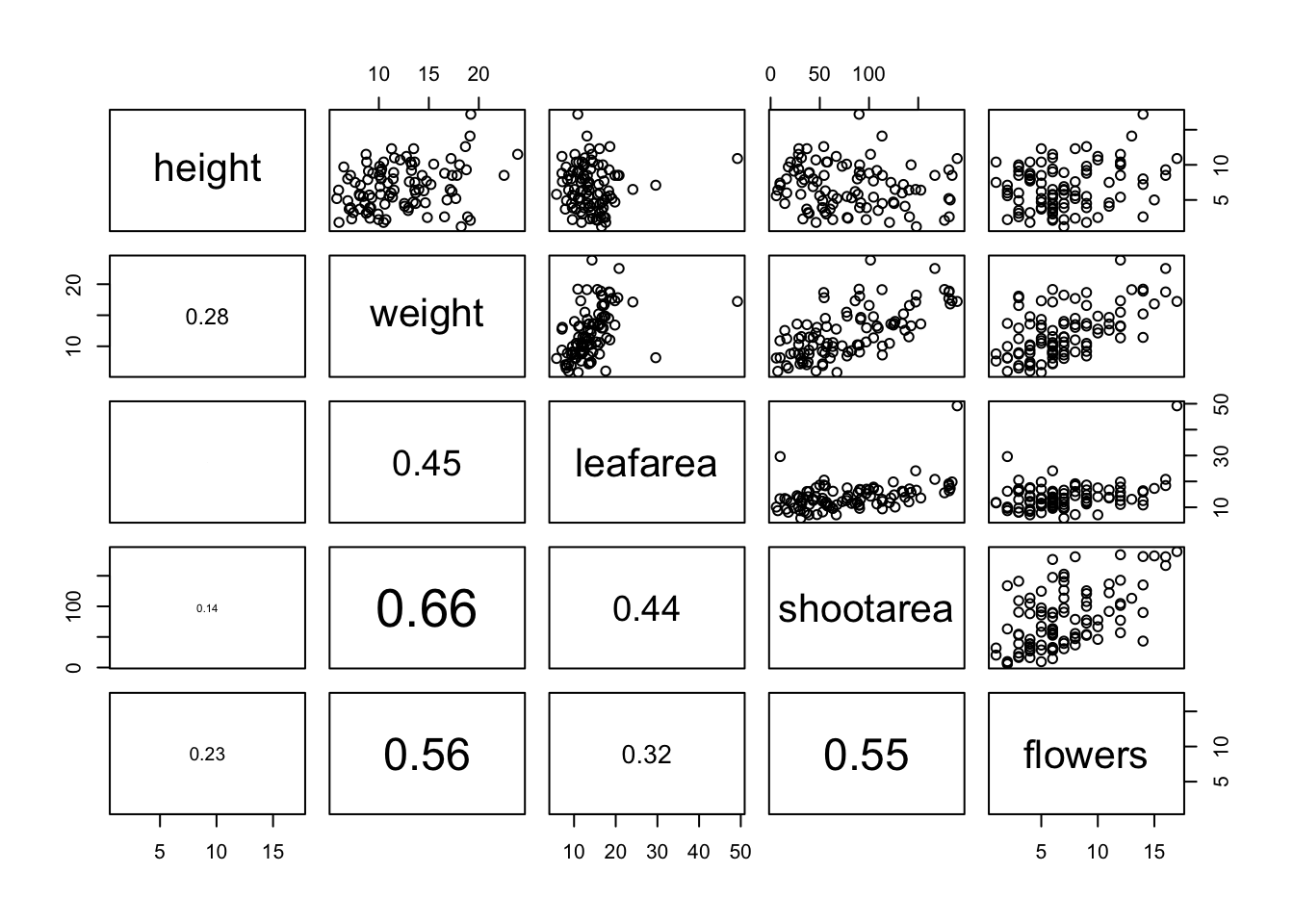 # pairs(flowers[, 4:8])Interpretation of the pairs plot takes a bit of getting used to. The panels on the diagonal give the variable names. The first row of plots displays the height variable on the y axis and the variables weight, leafarea, shootarea and flowers on the x axis for each of the four plots respectively. The next row of plots have weight on the y axis and height, leafarea, shootarea and flowers on the x axis. We interpret the rest of the rows in the same way with the last row displaying the flowers variable on the y axis and the other variables on the x axis. Hopefully you’ll notice that the plots below the diagonal are the same plots as those above the diagonal just with the axis reversed.
