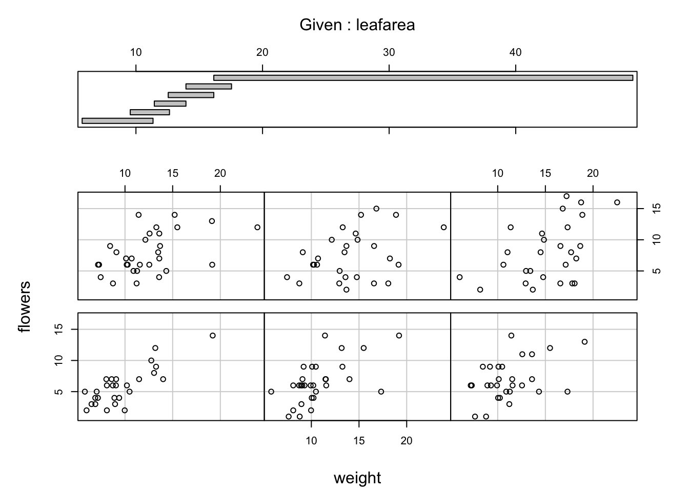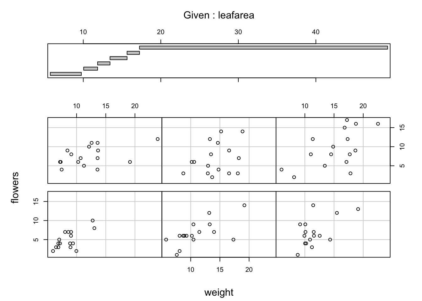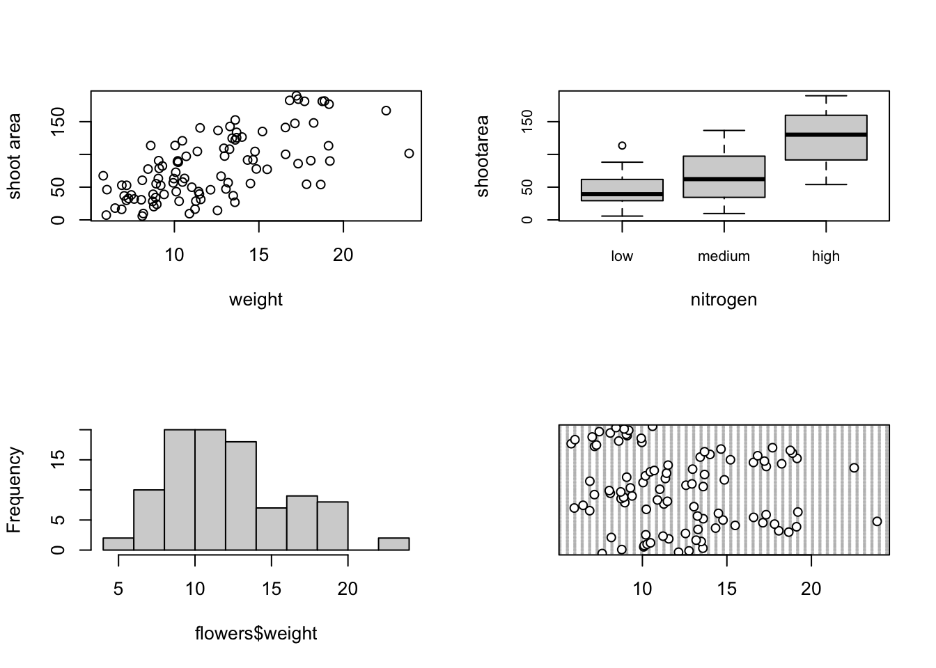 # pairs(flowers[, 4:8])Interpretation of the pairs plot takes a bit of getting used to. The panels on the diagonal give the variable names. The first row of plots displays the height variable on the y axis and the variables weight, leafarea, shootarea and flowers on the x axis for each of the four plots respectively. The next row of plots have weight on the y axis and height, leafarea, shootarea and flowers on the x axis. We interpret the rest of the rows in the same way with the last row displaying the flowers variable on the y axis and the other variables on the x axis. Hopefully you’ll notice that the plots below the diagonal are the same plots as those above the diagonal just with the axis reversed.