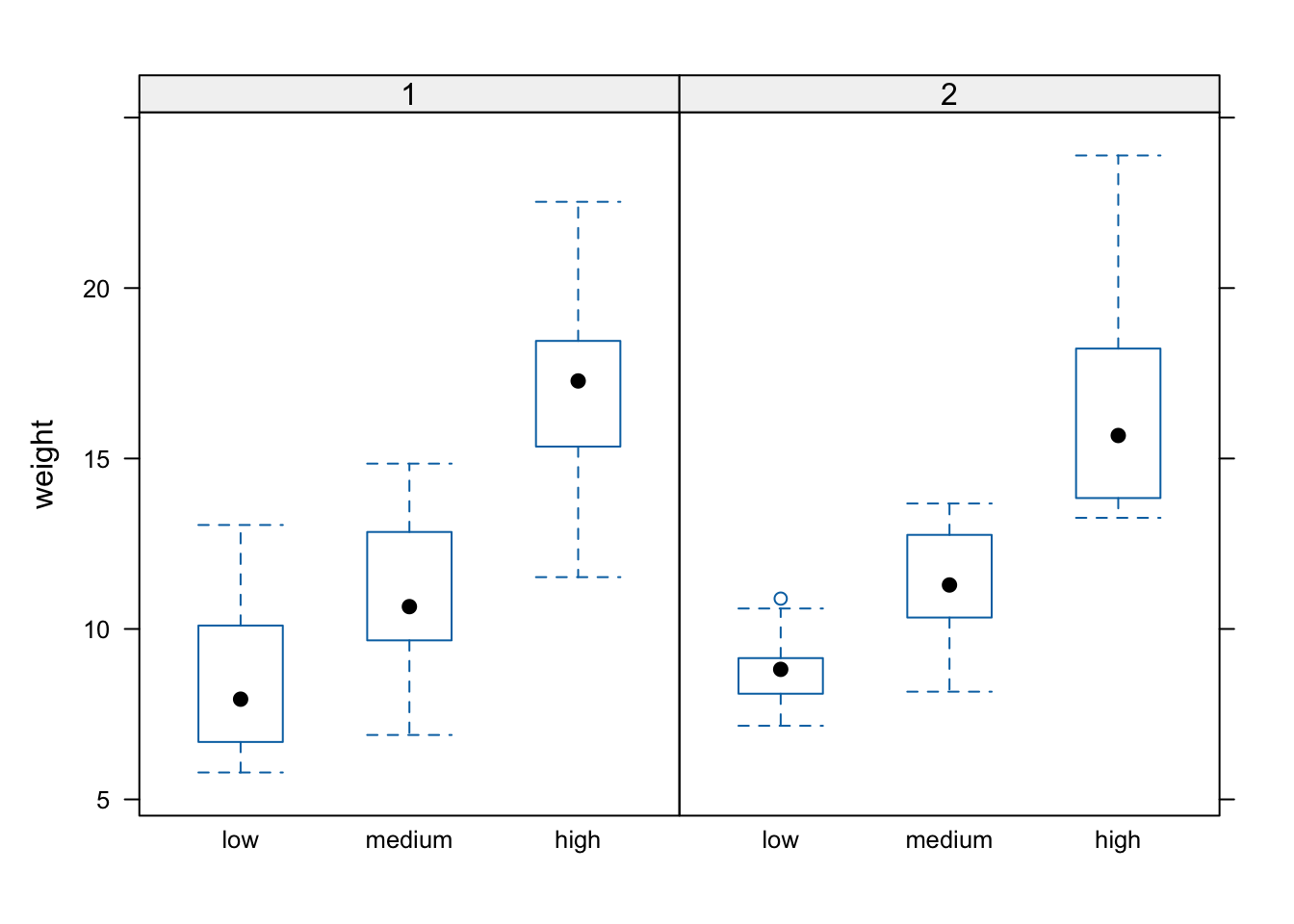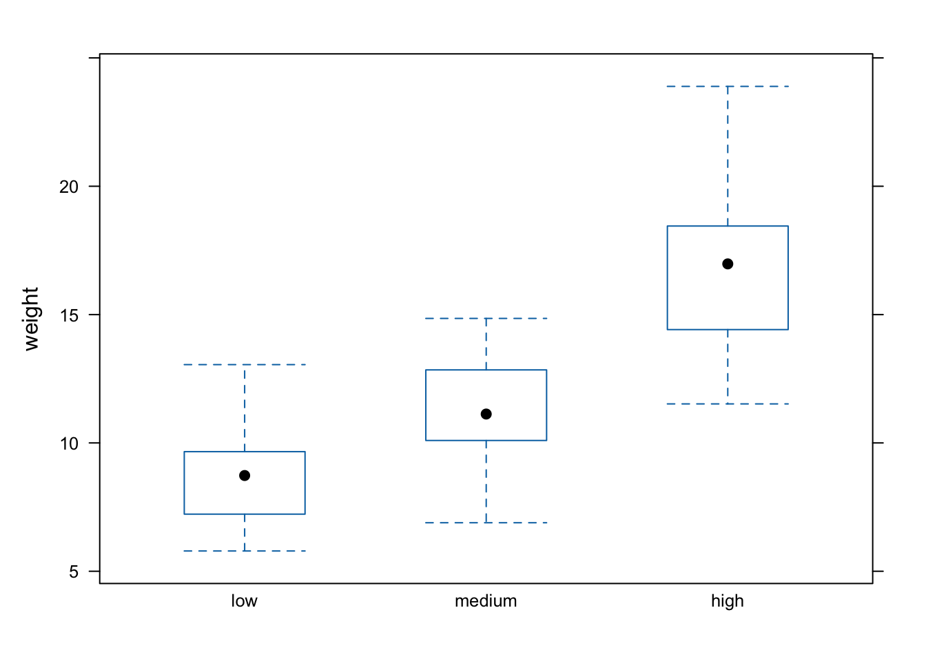 boxplot(weight ~ nitrogen, data = flowers,