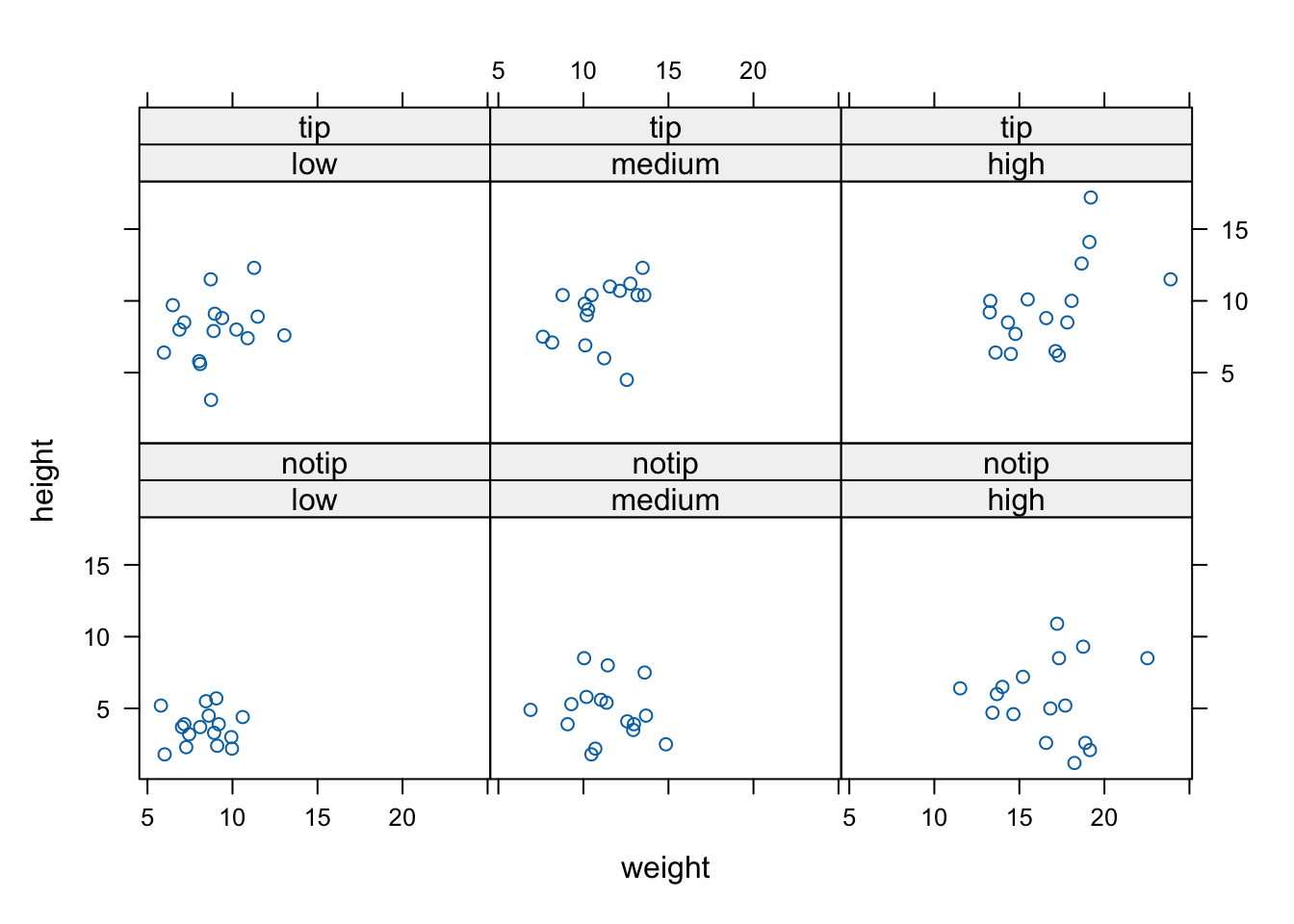 The lattice system is implemented in the lattice() package that comes pre-installed with the standard installation of R. However, it won’t be loaded by default so you’ll first need to use library(lattice) to access all the plotting functions. Unlike base R graphics, lattice plots are mostly generated all in one go using a single function so there’s no need to use high and low level plotting functions to customise the look of a plot. This can be a real advantage as things like margin sizes and plot spacing are adjusted automatically. Lattice plots also make a few more decisions for you about how the plots will look but this comes with a slight cost as customising lattice plots to get them to look exactly how you want can become quite involved. Where lattice plots really shine is plotting complex multi-dimensional data using panel plots (also called trellis plots). We’ll see a couple of examples of these types of plots later in the Chapter.