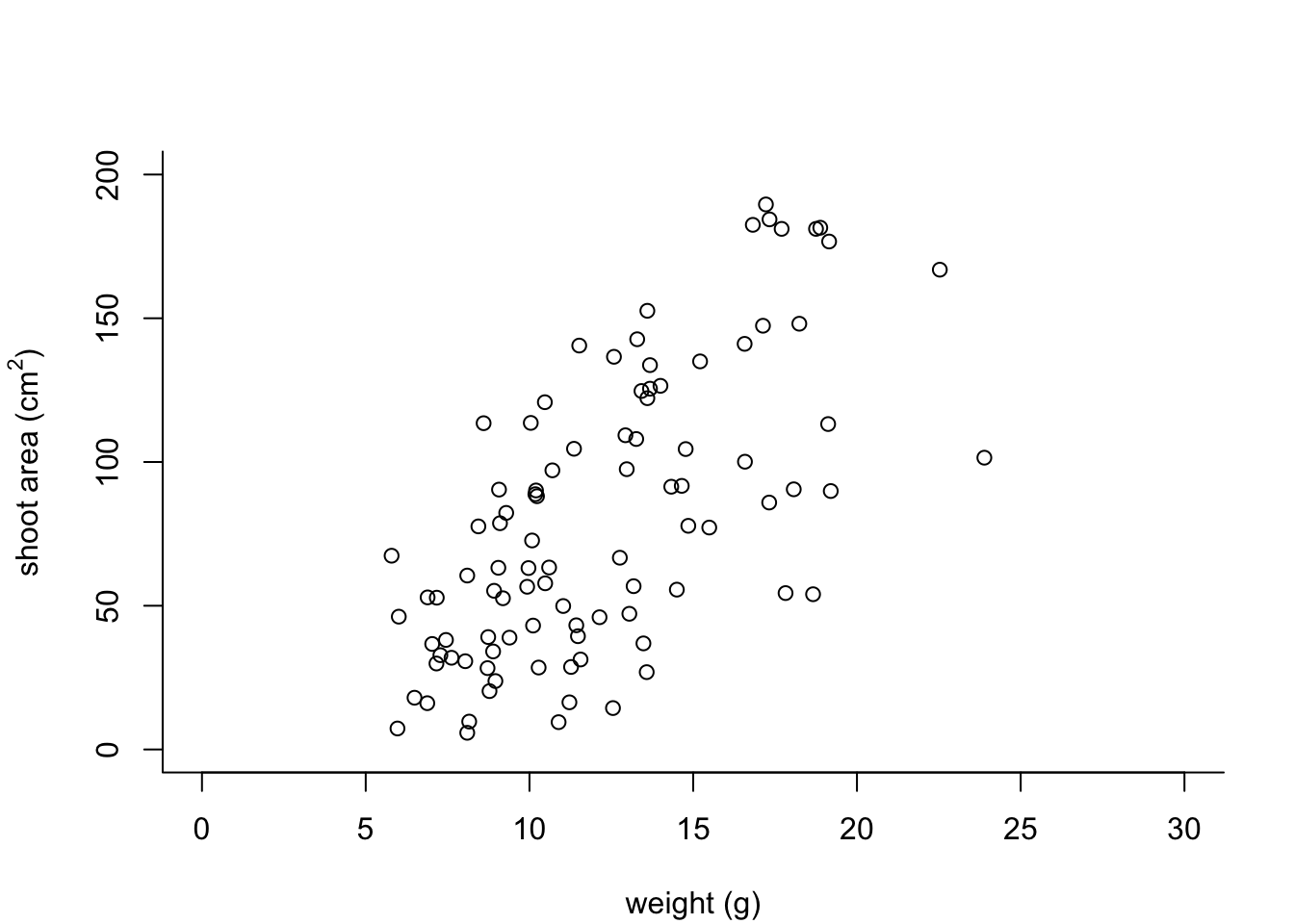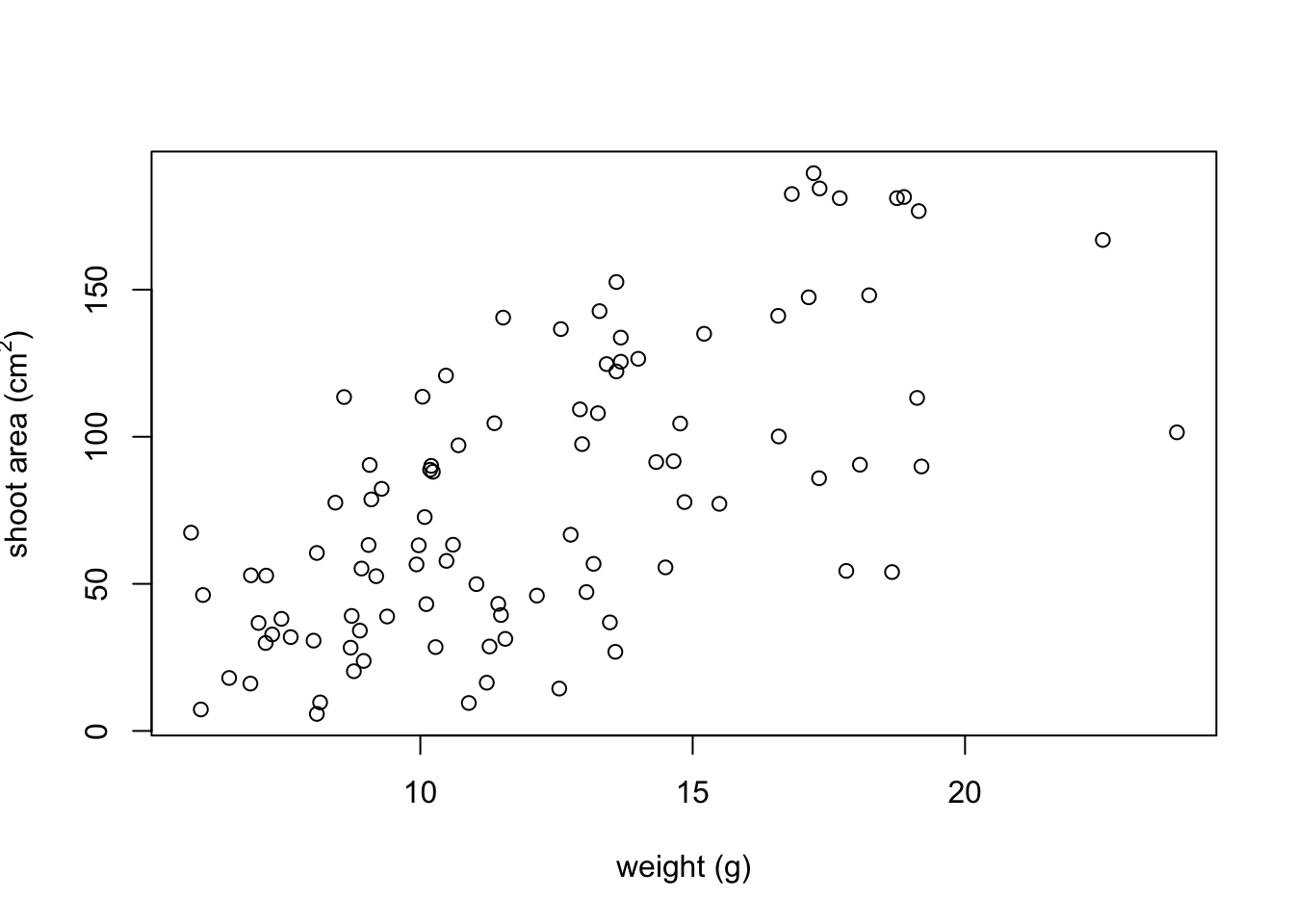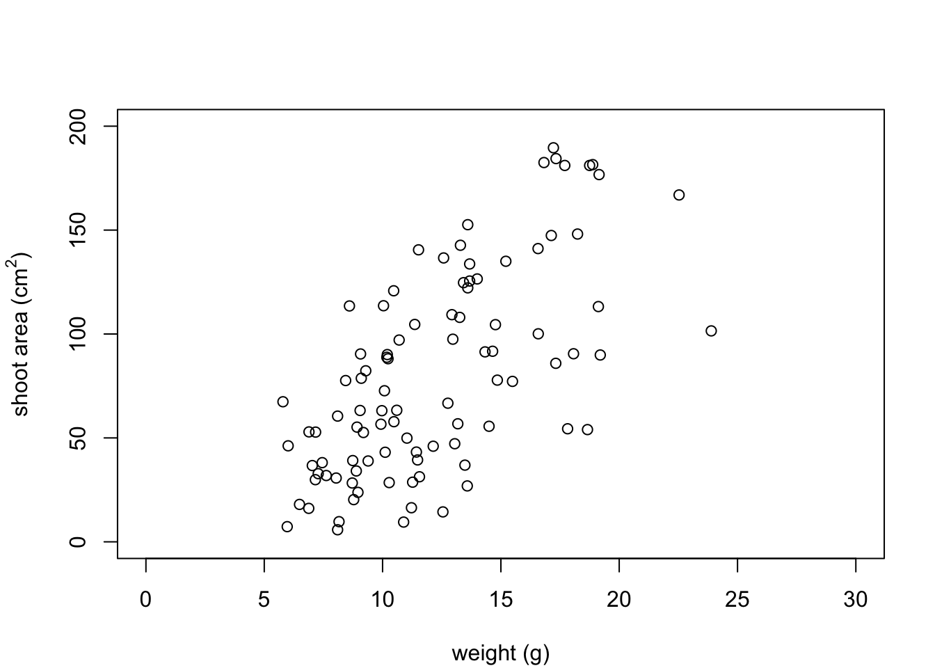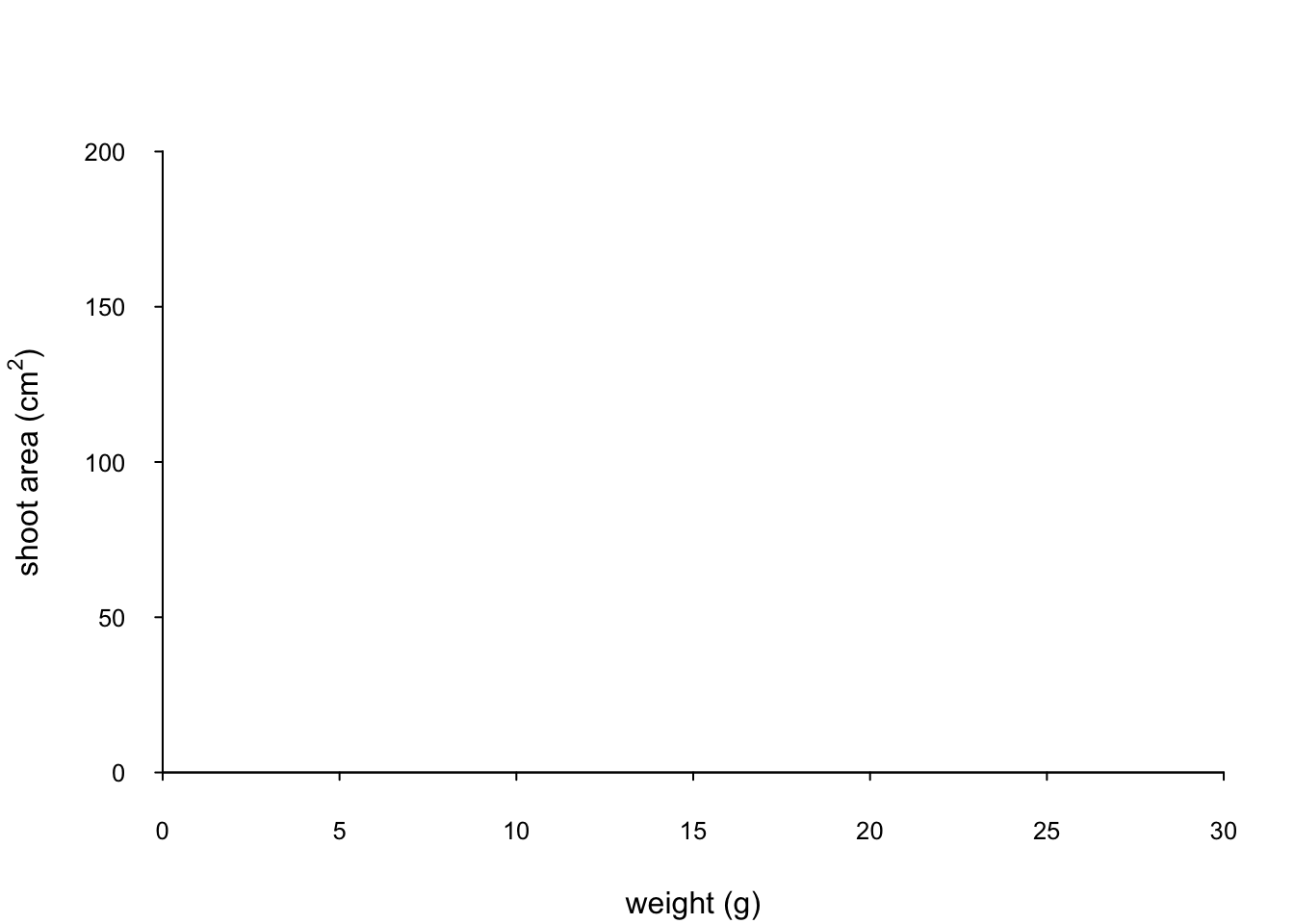 xlab = "weight (g)", ylab = "shoot area (cm2)")
