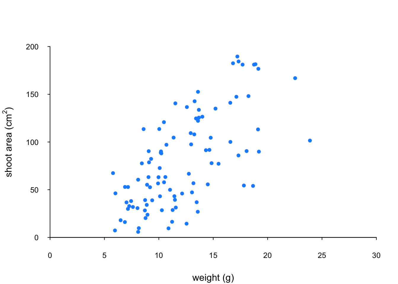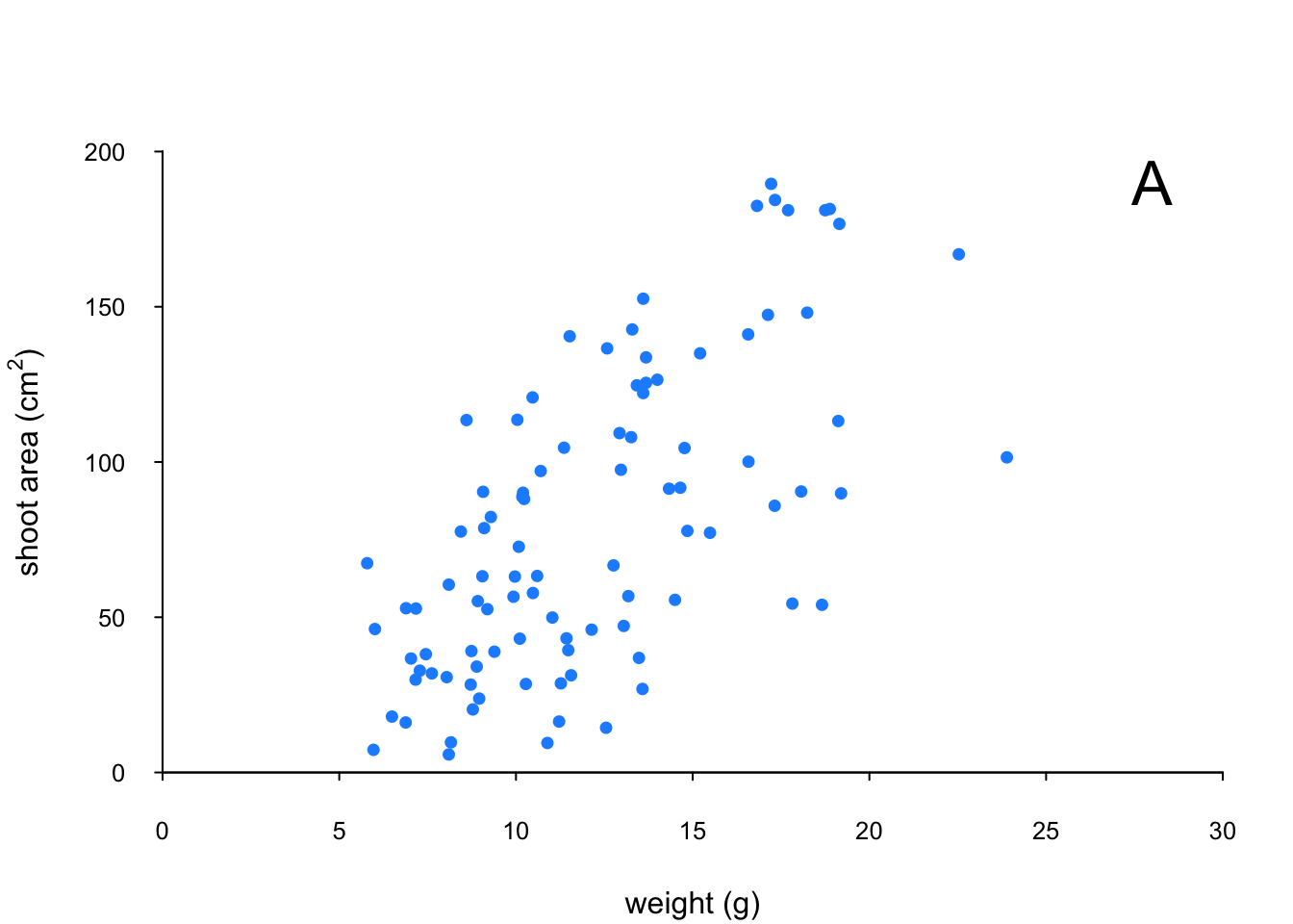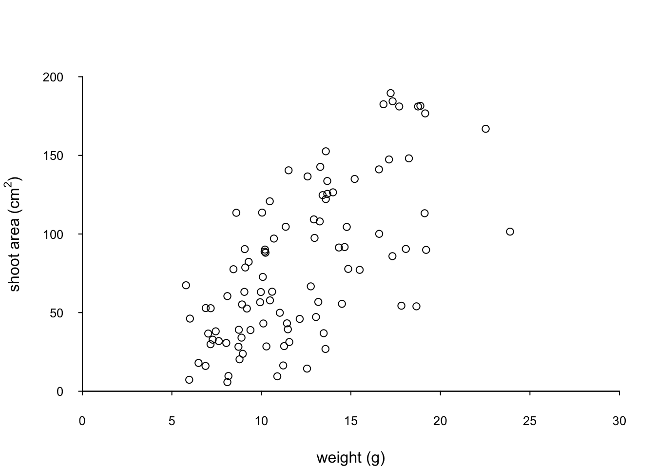 xlab = "weight (g)", ylab = "shoot area (cm2)")