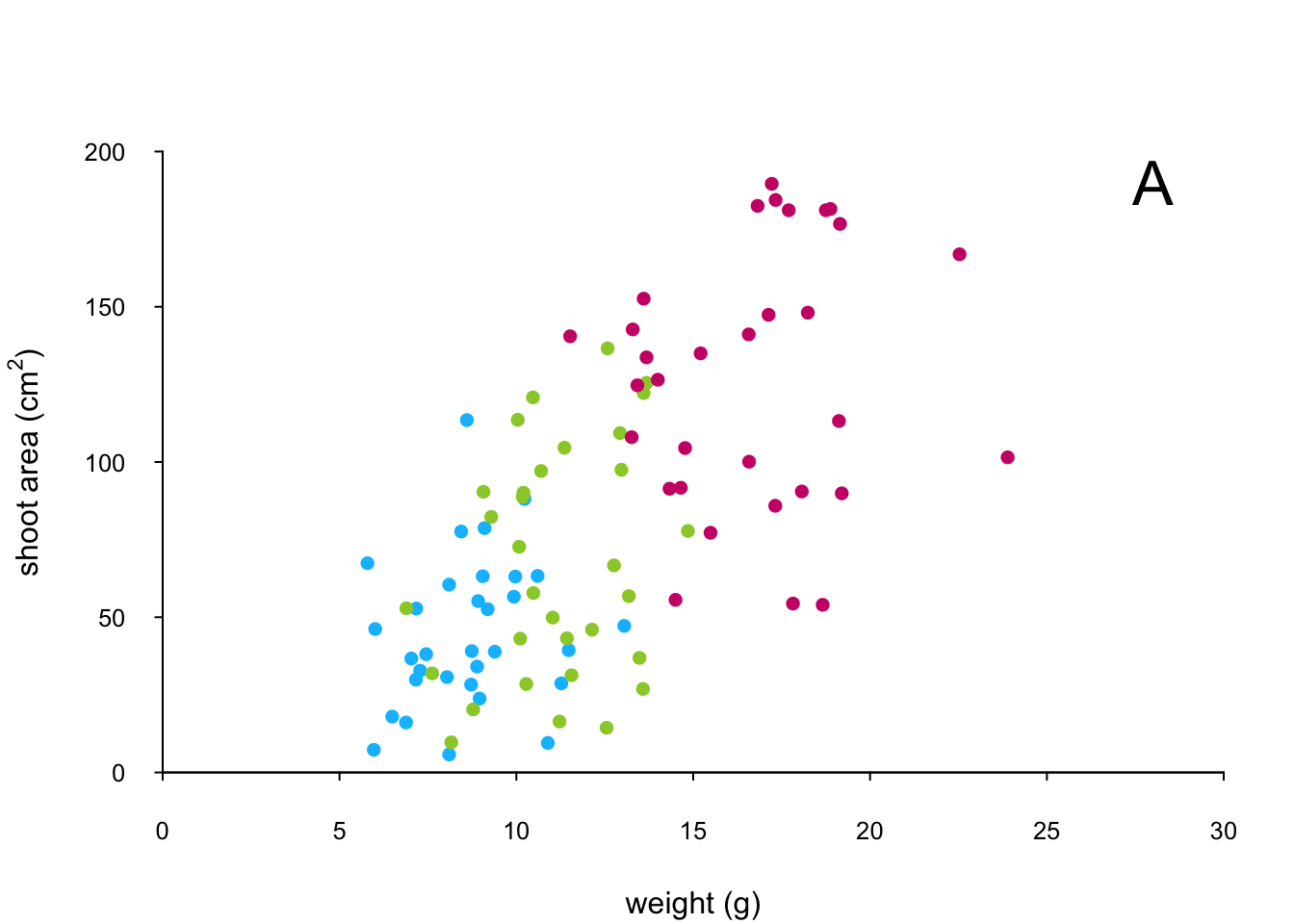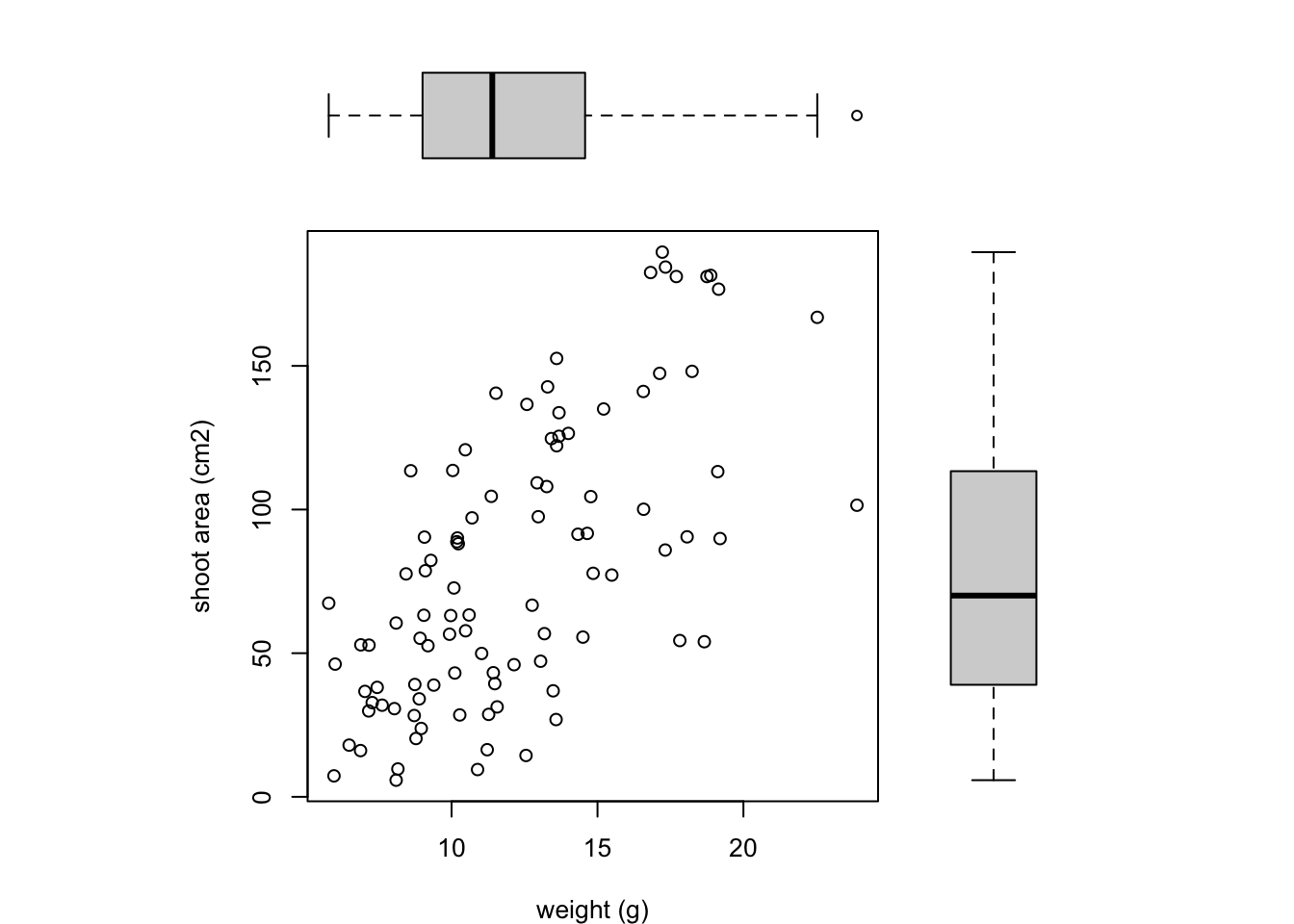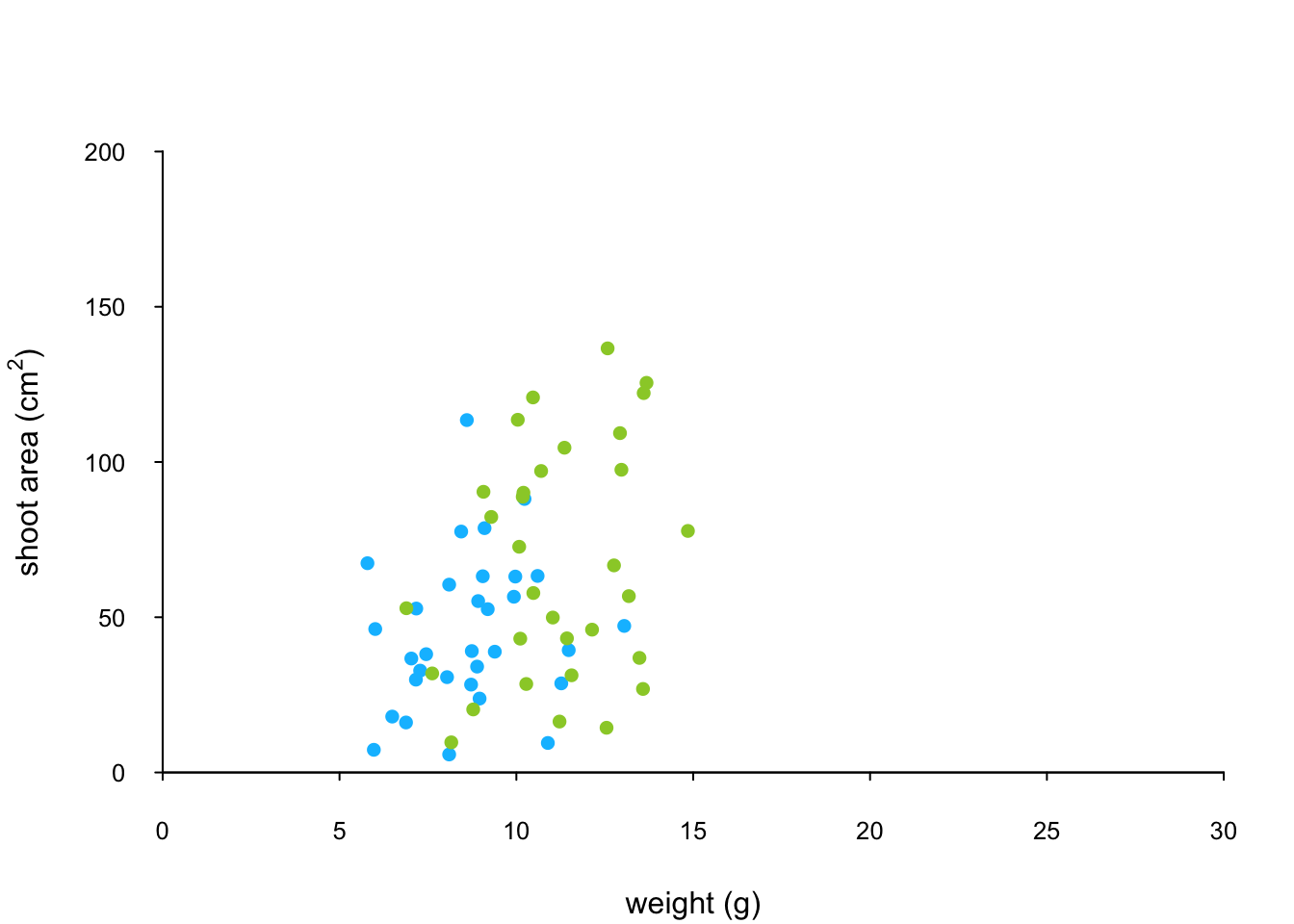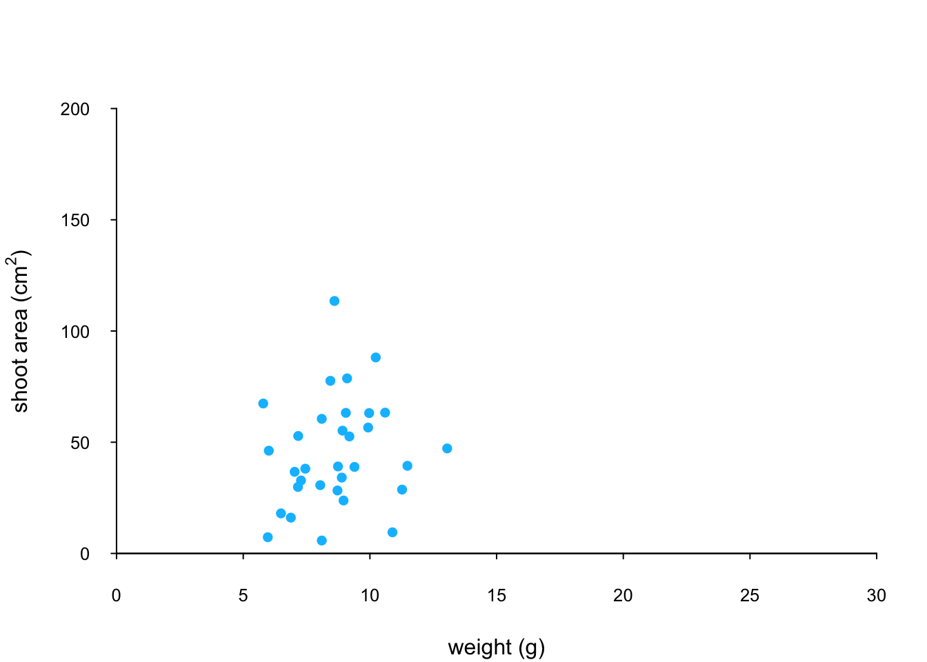 xlab = "weight (g)", ylab = "shoot area (cm2)")