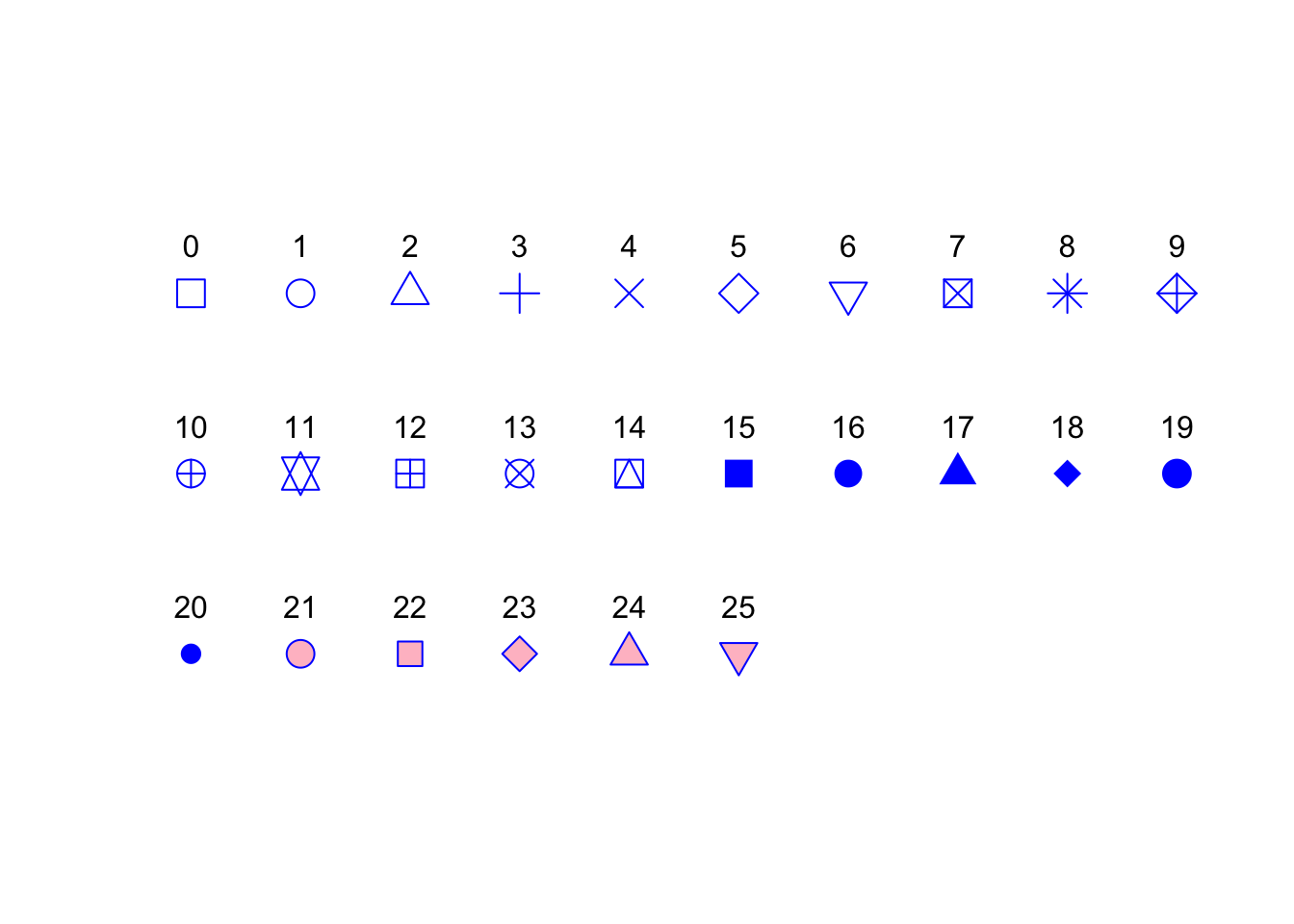 controls the type of symbol, either an integer between 0 and 25, or any single character within quotes " " |