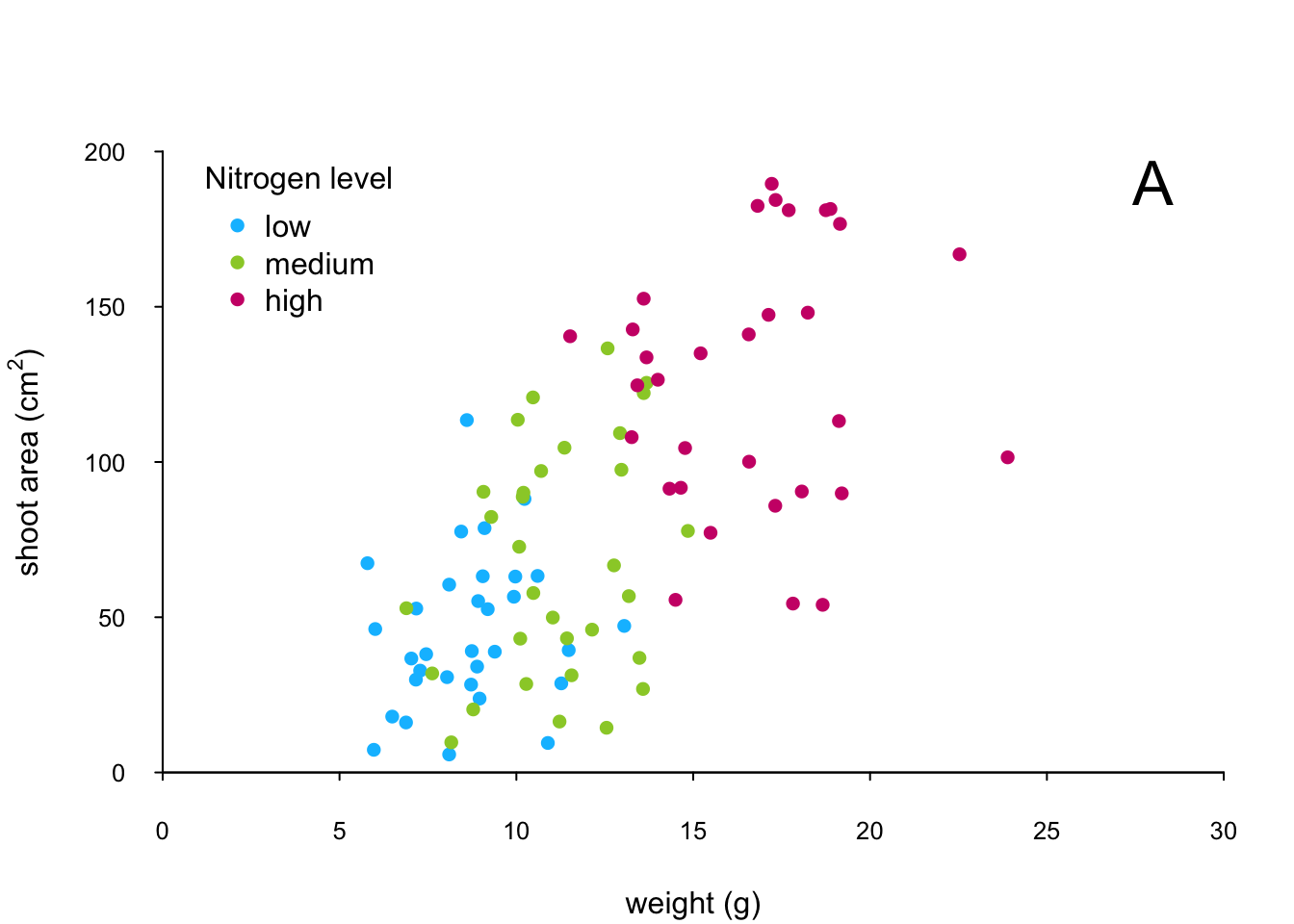 The only thing left to do is to add a legend to the plot to let your reader know what nitrogen level each colour corresponds to. We’ll use another low level function,legend() to do this. The legend() function requires us to provide the x and y coordinates to specify the position of the top left of the legend in the plot, a vector of colours, symbol types and labels to use in the legend. The bty = "n" argument stops a border being drawn around the legend and the title = argument gives the legend a title.