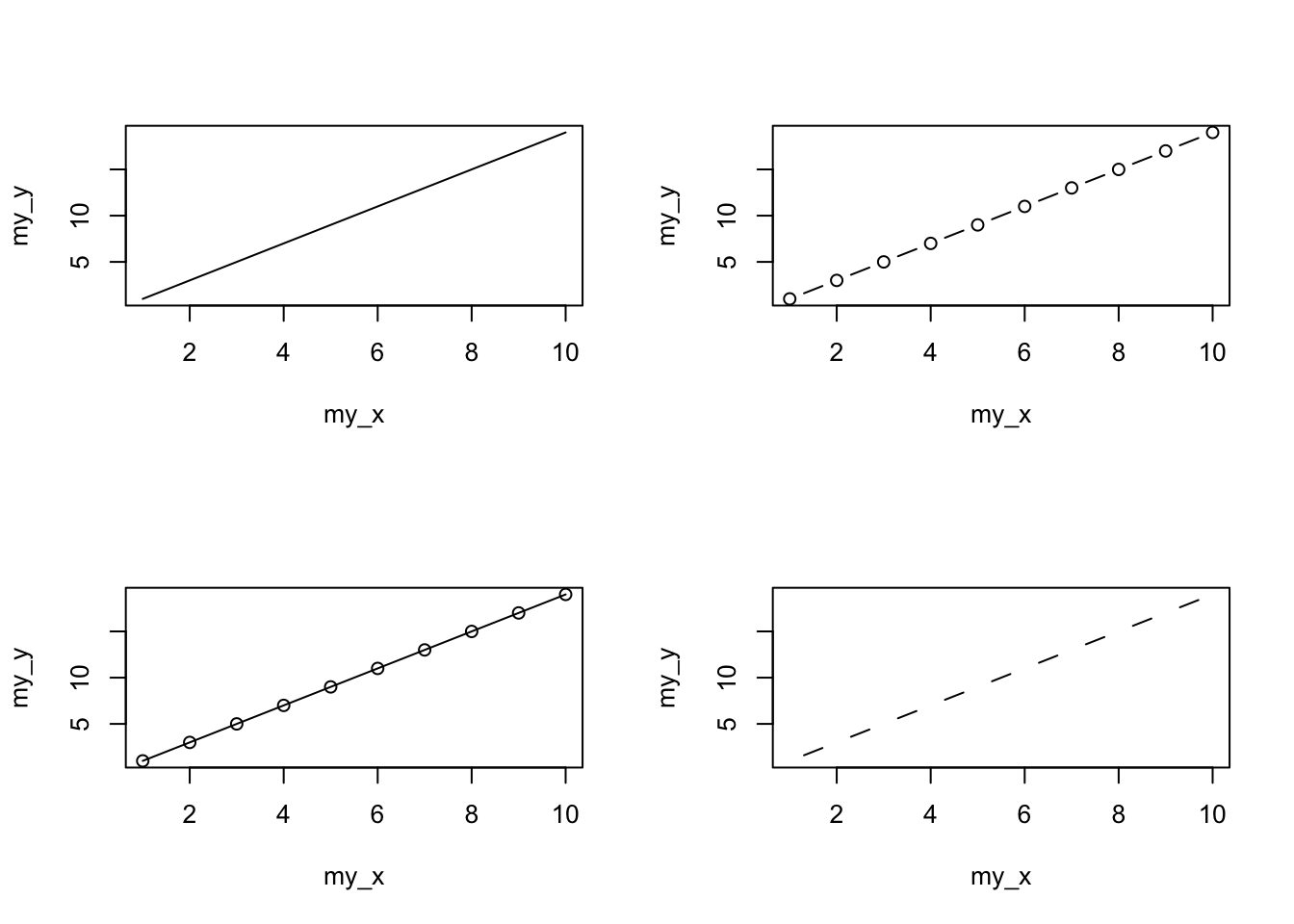 You can also specify the type of graph you wish to plot using the argument type =. You can plot just the points (type = "p", this is the default), just lines (type = "l"), both points and lines connected (type = "b"), both points and lines with the lines running through the points (type = "o") and empty points joined by lines (type = "c"). For example, let’s use our skills from previous chapter to generate two vectors of numbers (my_x and my_y) and then plot one against the other using different type = values to see what type of plots are produced. Don’t worry about the par(mfrow = c(2, 2)) line of code yet. We’re just using this to split the plotting device so we can fit all four plots on the same device to save some space. See later in the Chapter for more details about this. The top left plot is type = "l", the top right type = "b", bottom left type = "o" and bottom right is type = "c".