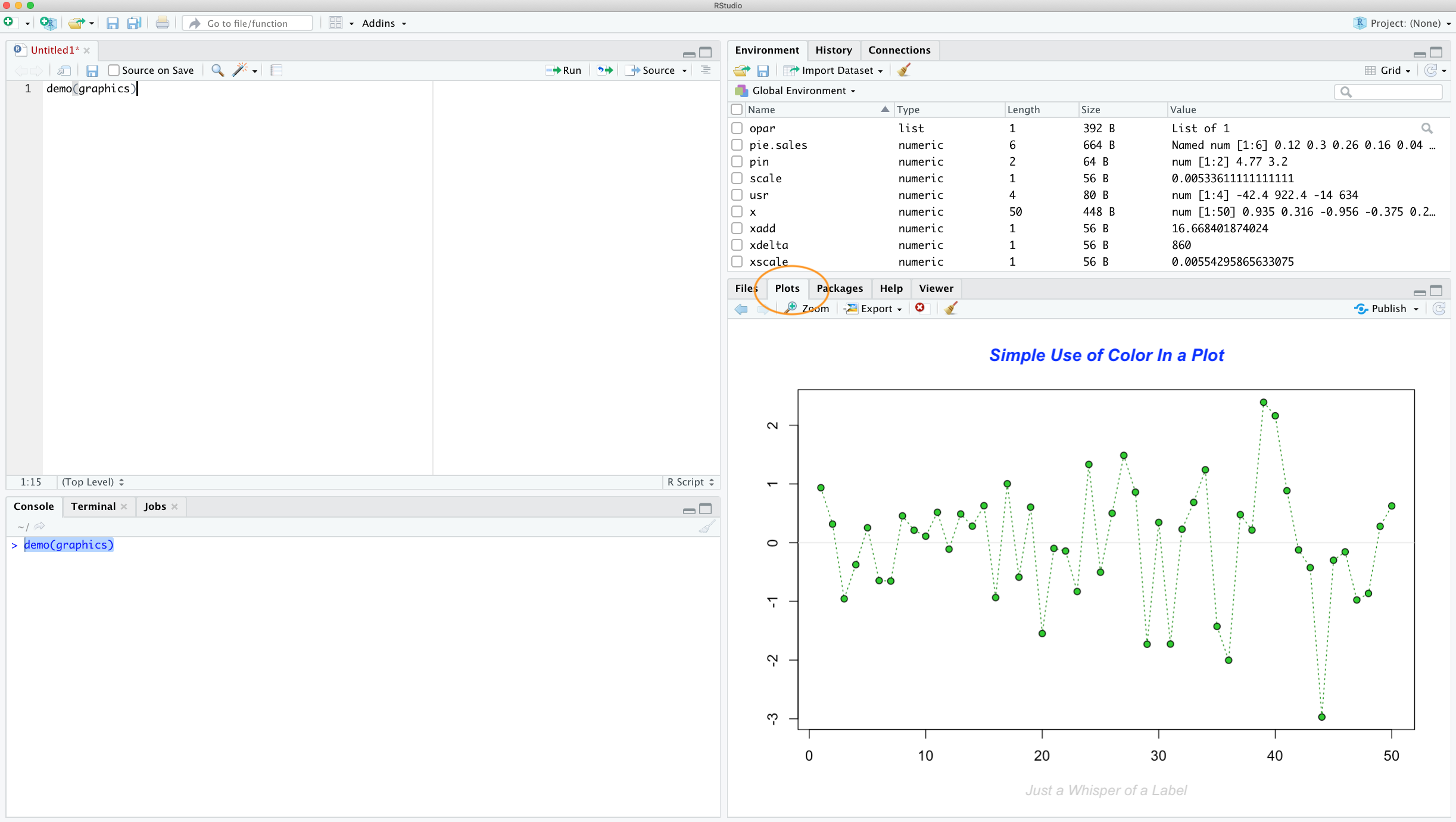 When you create a plot in RStudio the plot will be displayed in the ‘Plots’ tab by default which is usually located in the bottom right pane in RStudio.