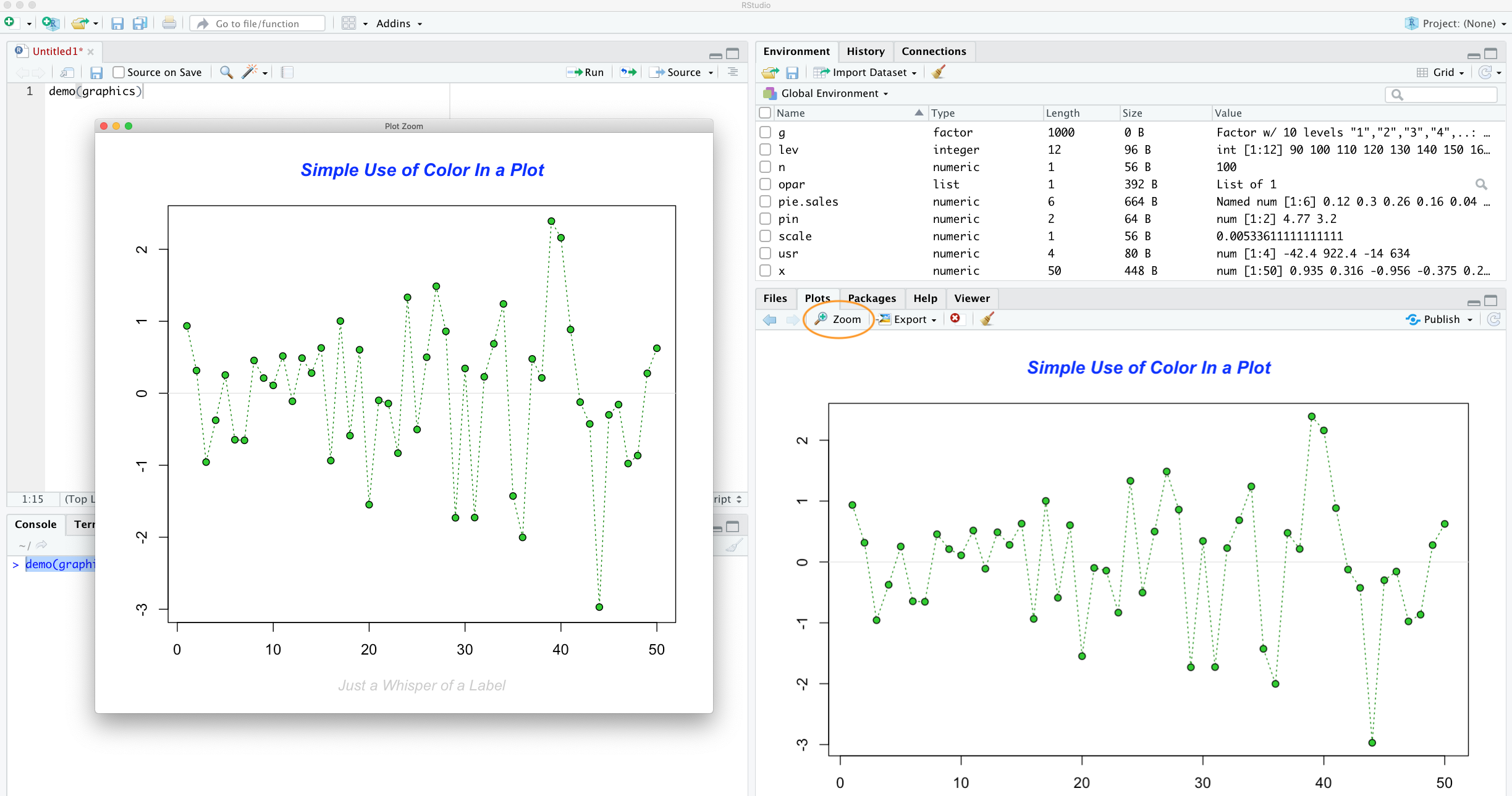 You can zoom in on a plot by clicking the ‘Zoom’ button which will display your plot in a separate window. This can be really useful if you have a particularly large or complex plot (we’ve noticed that RStudio sometimes fails to display a plot if it’s ‘big’). You can also scroll through plots you’ve previously created by clicking on one of the ‘arrow’ buttons.