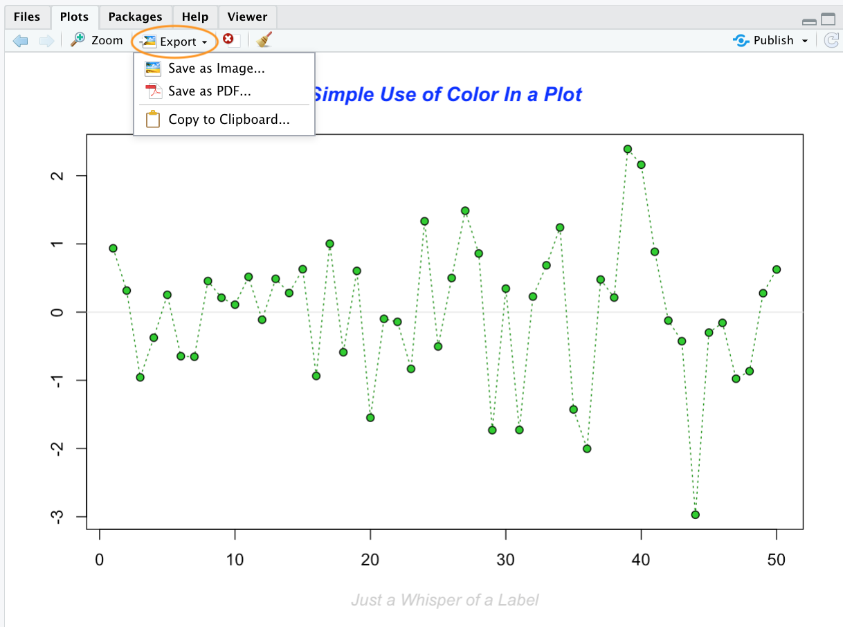 Plots can also be saved in a variety of formats (pdf, png, tiff, jpeg etc) by clicking on the ‘Export’ button and selecting your desired format. You can also redirect your plots to an external file using R code which we’ll cover later in this Chapter.