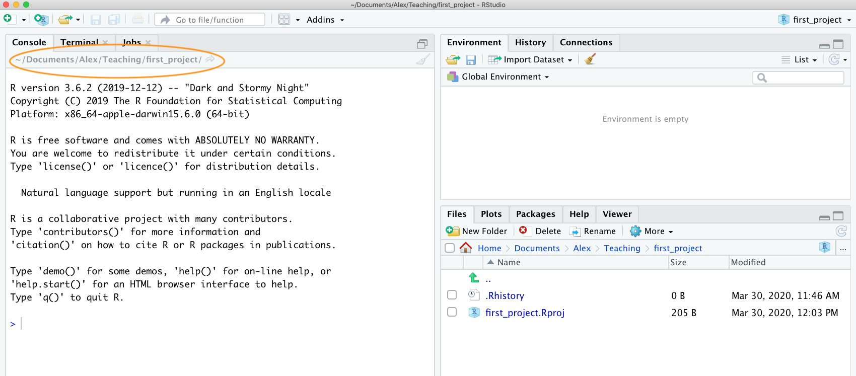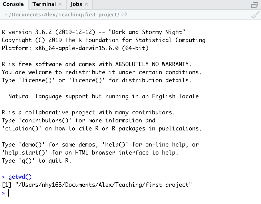 In the example above, the working directory is a folder called ‘first_project’ which is a subfolder of “Teaching’ in the ‘Alex’ folder which in turn is in a ‘Documents’ folder located in the ‘nhy163’ folder which itself is in the ‘Users’ folder. On a Windows based computer our working directory would also include a drive letter (i.e. C:/Users/nhy163/Documents/Alex/Teaching/first_project).