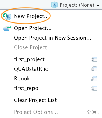 You can also create a new project by clicking on the ‘Project’ button in the top right of RStudio and selecting ‘New Project…’