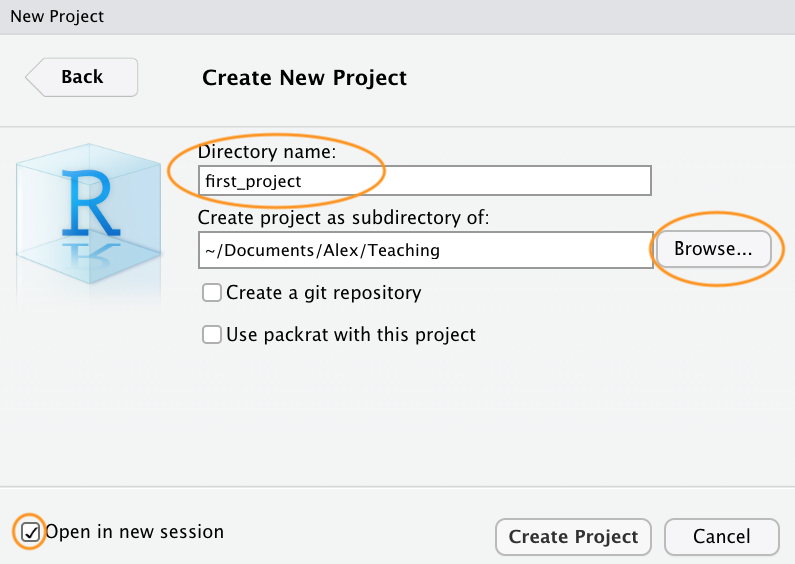 Now enter the name of the directory you want to create in the ‘Directory name:’ field (we’ll call it first_project for this Chapter). If you want to change the location of the directory on your computer click the ‘Browse…’ button and navigate to where you would like to create the directory. We always tick the ‘Open in new session’ box as well. Finally, hit the ‘Create Project’ to create the new project.