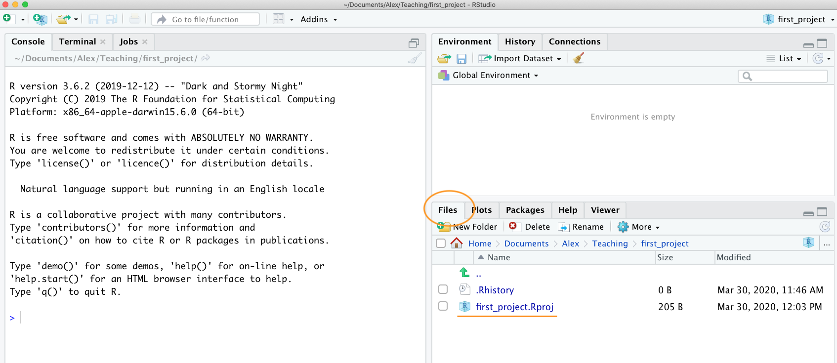 Once your new project has been created you will now have a new folder on your computer that contains an RStudio project file called first_project.Rproj. This .Rproj file contains various project options (but you shouldn’t really interact with it) and can also be used as a shortcut for opening the project directly from the file system (just double click on it). You can check this out in the ‘Files’ tab in RStudio (or in Finder if you’re on a Mac or File Explorer in Windows).