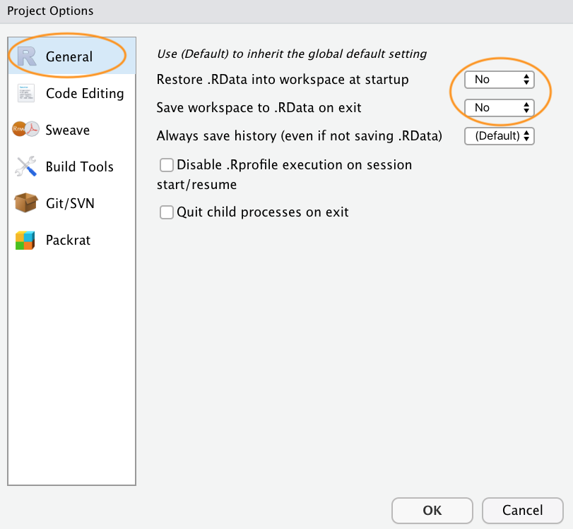 The last thing we suggest you do is select Tools -> Project Options... from the menu. Click on the ‘General’ tab on the left hand side and then change the values for ‘Restore .RData into workspace at startup’ and ‘Save workspace to .RData on exit’ from ‘Default’ to ‘No’. This ensures that every time you open your project you start with a clean R session. You don’t have to do this (many people don’t) but we prefer to start with a completely clean workspace whenever we open our projects to avoid any potential conflicts with things we have done in previous sessions. The downside to this is that you will need to rerun your R code every time you open your project.