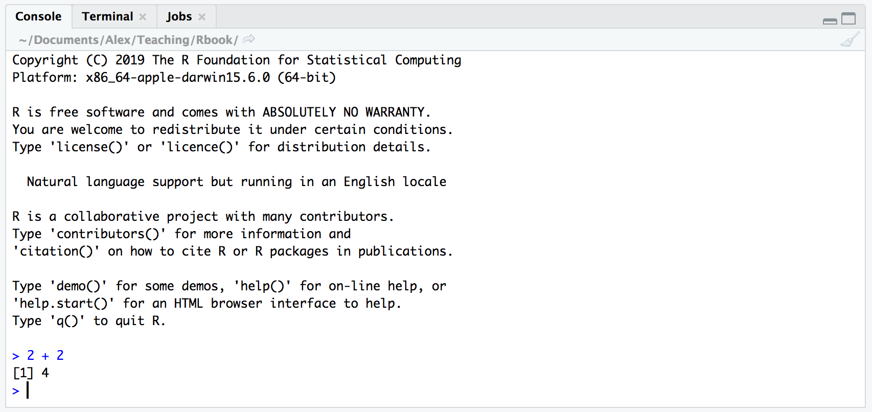 The Console is the workhorse of R. This is where R evaluates all the code you write. You can type R code directly into the Console at the command line prompt, >. For example, if you type 2 + 2 into the Console you should obtain the answer 4 (reassuringly). Don’t worry about the [1] at the start of the line for now.
