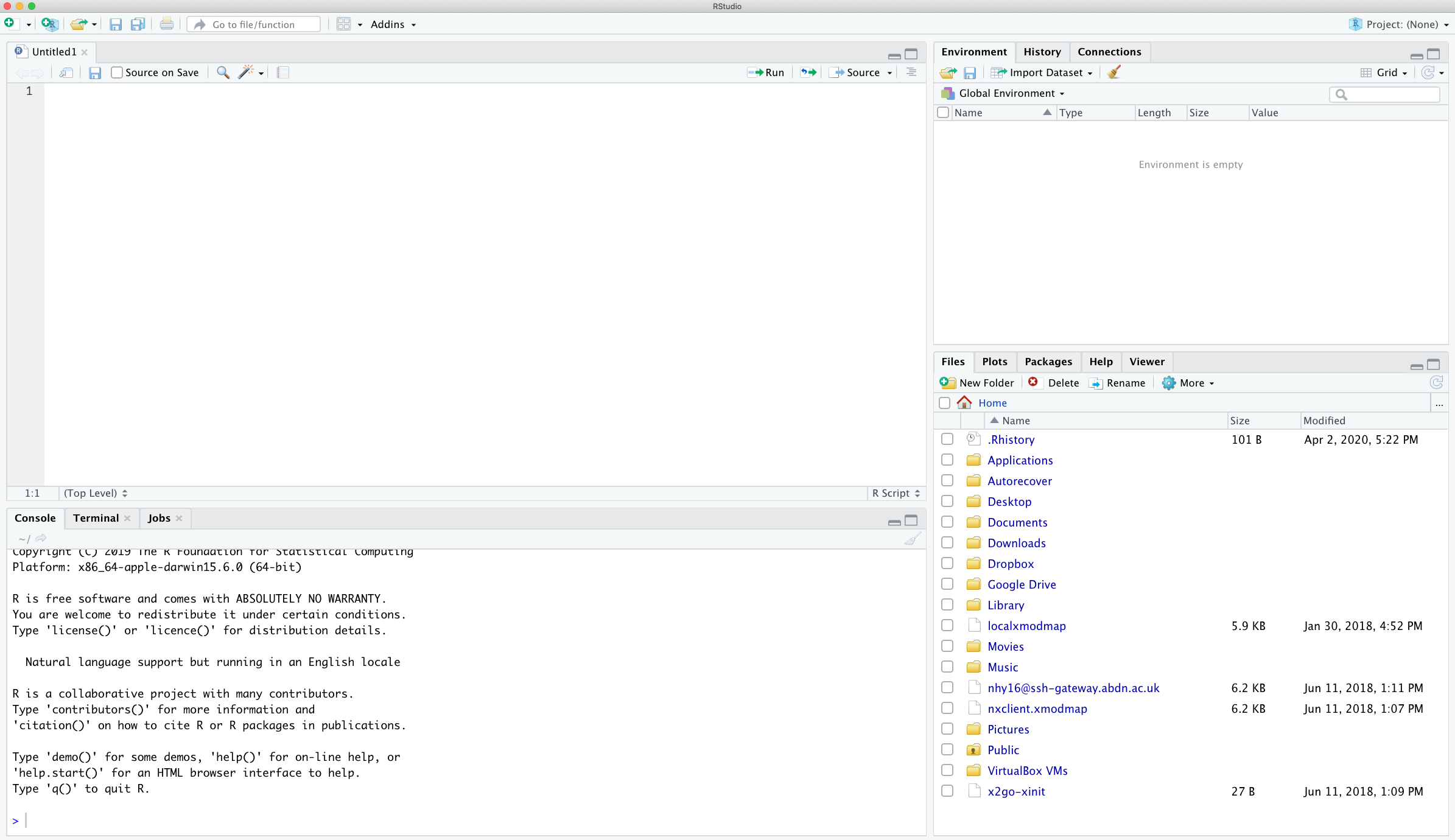 When you open R studio for the first time you should see the following layout (it might look slightly different on a Windows computer).